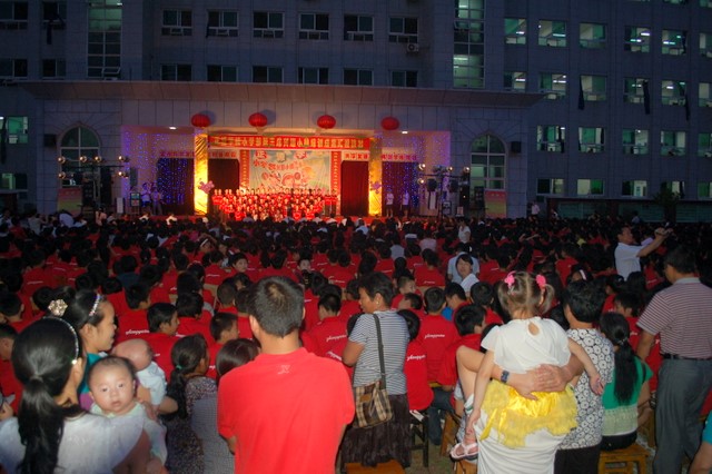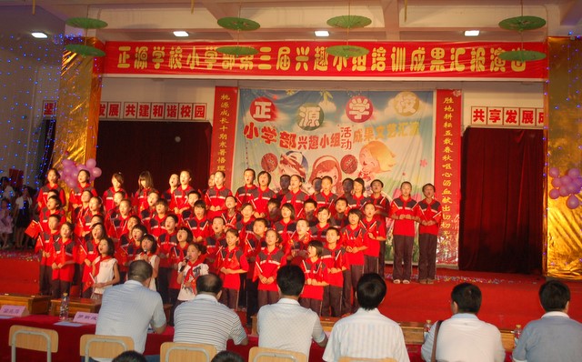 19点20分,随着主持人梁爱军、黄婷、王敏瑶、周逸群的出场,晚会随之拉开帷幕,全场掌声雷动,洋溢在一片欢乐的海洋里。参加这次汇报演出的阵容强大,内容丰富,节目精彩不断。每个年级都表演了各自的节目:学前班的舞蹈《快乐的儿歌》,童真童趣;一年级的古诗新唱《明日歌》,集古今于一体;二年级的快板《夸正源》,铿锵激越;三年级的相声《反义词》,引人入胜;四年级的情景剧《我们共同的家园》,感情真挚;五年级的诗歌朗诵《祖国》,激情豪迈;六年级的歌伴舞《愿祖国花好月圆》,激情豪迈;最后,教师代表队表演的《健美操》,将晚会推向高潮。