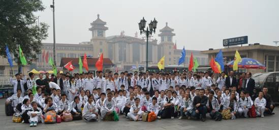 9月29日14点20分,北京站前,williamhill威廉希尔亚洲官网励志行的学生们合影,并声欢呼:“北京,我们来了!”
