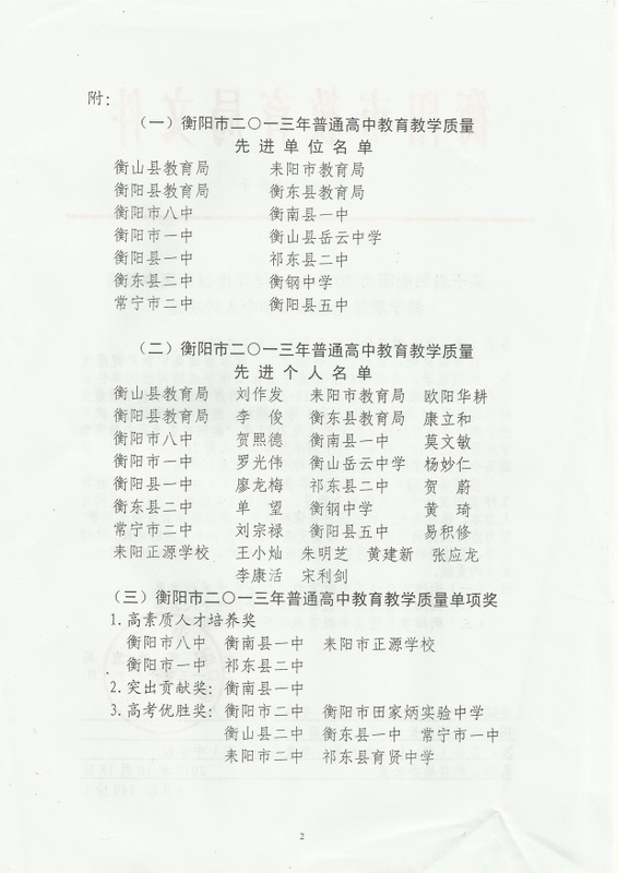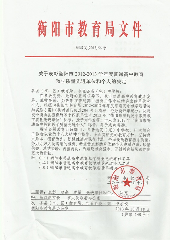 今年,衡阳市考取北大清华共11人,较前年的3人和去年的6人有很大的进步。其中,我校与衡阳市八中、衡南一中各占3席,衡阳市一中、祁东二中各占1席。今年,衡阳市有5人进入湖南省理科前100名,我校占3人、衡南一中2人,与2012年一样,两校再一次囊括了衡阳市前五名。
