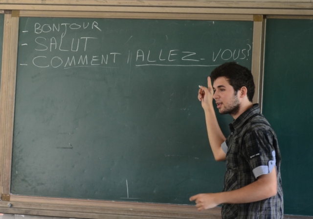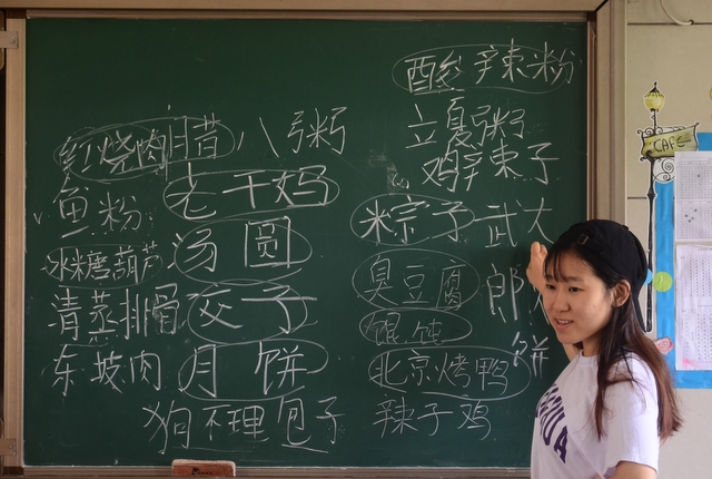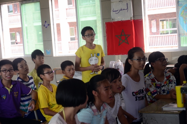 13班的高尧,这个自信阳光的男孩今天已是寝食不安,中晚餐就餐时,竟“死皮赖脸”的坐到外籍志愿者的餐桌上,与志愿者们一同吃饭,锻炼口语能力。其“醉翁之意不在酒”,就在乎能有更多的时间与志愿者交流。高尧很喜欢历史,用并不流畅的英语向志愿者介绍第二次世界大战和抗日战争。“I hate Hitler and Mussolini”引得大家哄堂大笑。来自突尼斯的Malek和来自波兰的Monika已深深地喜欢上了这位才读初一的学生。