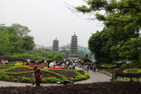 游览完叠彩山后,职工们坐着自己的大巴,直奔下个观赏点——日月双塔。