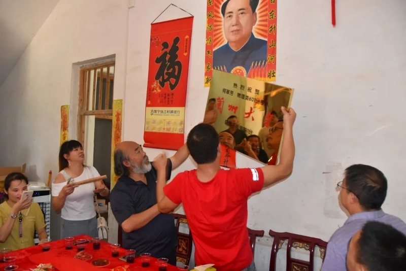 按照当地风俗,何家在自家厅屋早已备下酒水饮料和茶果,邀罗校长进屋“劝杯”。厅屋右面墙上,张贴着许多奖状,正面墙上张贴毛泽东主席画像。罗校长说:“把铜匾挂起来吧,挂在主席像下面。”何翠芳初中班主任王锐老师个子高,三下两下定好钉子,认真庄重的挂上铜匾,大家热烈鼓掌,高喊:“好!好!”