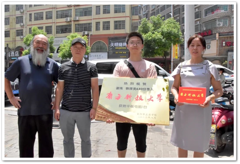 8月3日,罗校长率高三年级主任陈斌、班主任董树伟、石海玉及老师同学们,带着铜匾和平板电脑来到神龙广场祝贺谢伟物理类640分考取南方科技大学。