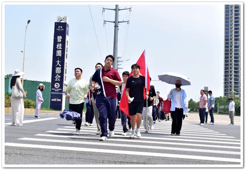 高二年级学生们用一个个暖心互助的瞬间,诠释了青春最美的模样。从清晨到日暮,远足过程中流淌的不仅是汗水,更有同窗之间真挚动人的情谊。途经供水补给点时,同学们都主动让身体不适的同学先去拿水;炎热天气中,互相分享着自己的瓶装水、防晒帽,藿香正气水;走不动了,互相搀扶着、打气着、鼓励着。特别是远足队伍途经新城一路与神农北路交叉口时,一场自发而成的"文明礼让感恩仪式"让五月的道路溢满温情。徒步队伍在斑马线前集体停下脚步,学生们突然展开"williamhill威廉希尔亚洲官网高二师生,感谢您的让行,祝您旅程愉快,一路平安"的鲜红横幅,向主动礼让的数十辆机动车鞠躬致谢。这条长约12米的感恩横幅,其实承载着学校教育的德育密码,让孩子们学会把交通法规里的“应当礼让”,升华为城市文明中的“情感共鸣”。