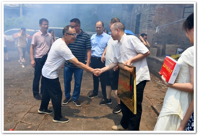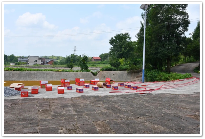 8 月 5 日的大和圩乡雅江二十组,艳阳高照、热火朝天,青砖黛瓦的刘家祠堂前一片欢腾。礼花带着尖锐的哨音刺破天际,在蓝天白云间绽成朵朵金菊,鞭炮碎屑像被风揉碎的晚霞,簌簌落在祠堂的飞檐翘角与阶前的青石板上。