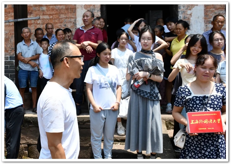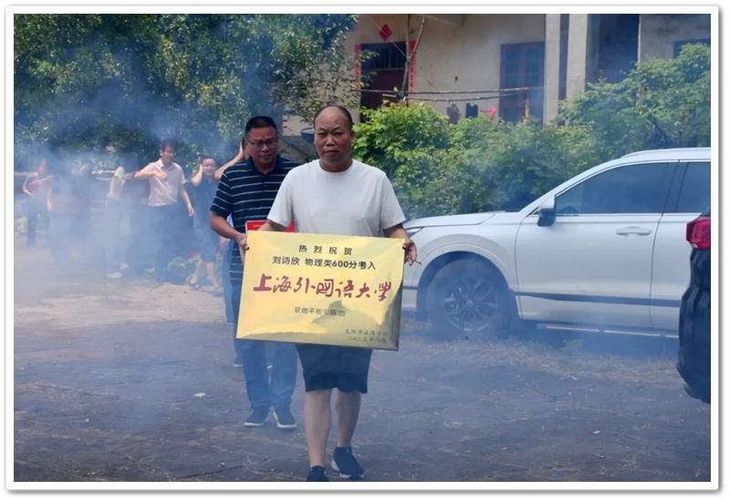 校办公室主任朱明之、校德育主任王伟荣、高三班主任伍金坤等老师同学们带着恭贺铜匾、平板电脑和烟花鞭炮来到祠堂,刘仁杰一一附耳寒暄。久久不息的鞭炮轰鸣一阵又一阵盖过声声久违的问候与热切的祝贺,却盖不住他们唇间绽放的笑容和眼角流淌的欣慰。