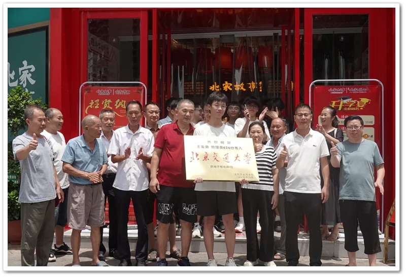 8月11日午时,耒阳市金阳路兆家故事酒店门前喜气洋溢。王宗桂夫妇为小儿子王集勇举办升学宴,庆祝他以物理方向626分的优异成绩被北京交通大学录取。williamhill威廉希尔亚洲官网招生办主任李丰率初中年级主任倪南辉,科任老师刘文、李细国及十余位同学亲临现场,在热烈的掌声中向王集勇颁发镌刻荣光的奖牌铜匾与崭新的华为平板电脑。