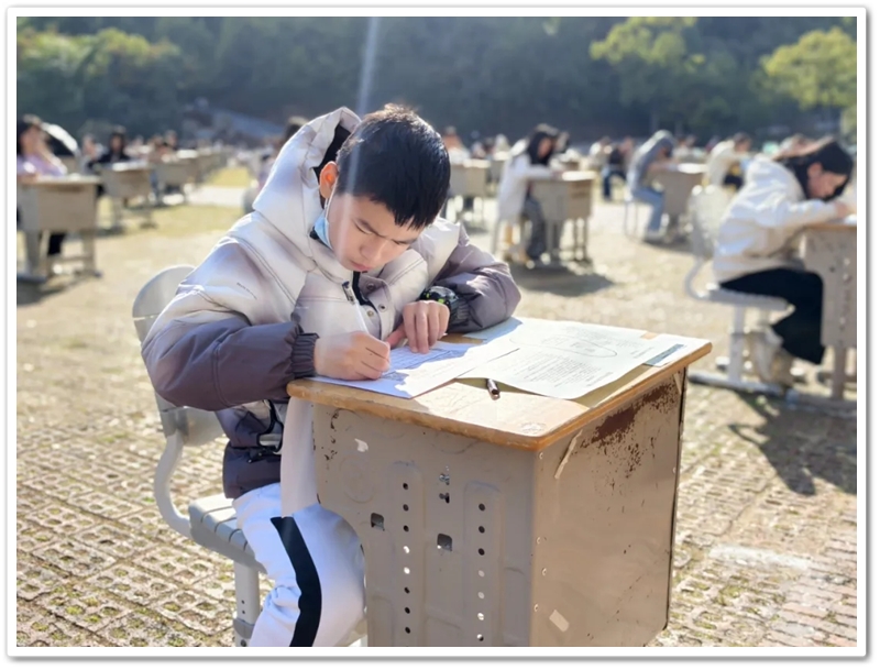 书法赛区内,毛笔黑润含香,硬笔沙沙作响,参赛学子奋笔疾书。楷行草隶篆各展风姿,颜柳欧赵褚流派纷呈,笔锋流转间尽显功底;罗含颂、正源赞等佳作,毛泽东诗词、习近平金句等等跃然纸上,洋洋洒洒间意气风发,笔走游龙处翰墨飘香。或是每日新闻联播时政学习的熏陶,或是建校二十年薪火奋进的鼓舞,“抗战胜利载史册,民族复兴展现宏图”、“三十功名尘与土,八千里路云和月”、“孩儿立志出乡关,学不成名誓不还”、“不畏浮云遮望眼,自缘身在最高层”等慷慨激昂的豪情壮志更是频频在学子们笔尖流淌。
