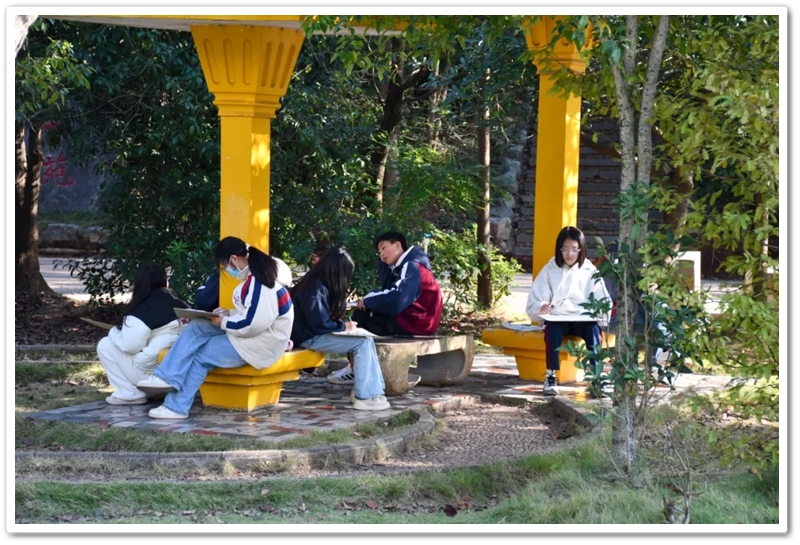 绘画赛区则依山就势、顺其自然,同学们如同平日户外写生课一般,分散在广场东南西北各个角落。池塘边、树荫下、假山上、石桌旁、花丛中,处处可见他们专注创作的身影,画笔翻飞间灵感迸发。素描的细腻、水彩的灵动、水粉的厚重,各类画作琳琅满目;校园风景、课堂瞬间、航空遐想等题材丰富多元,卡通风格、速写纪实、科幻创意等画风各显神通。提质改造的校园环境更具诗情画意,星罗棋布的画夹愈发五彩缤纷,正源孩子们尽情挥洒着他们独有的内心钟爱与无限创意。