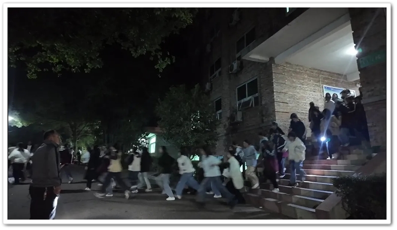 住在11号楼的初二、准高一及高一学生们用毛巾捂鼻,踩着小碎步快步跑下楼梯,由通道两头奔向中学部运动场安全集结点。