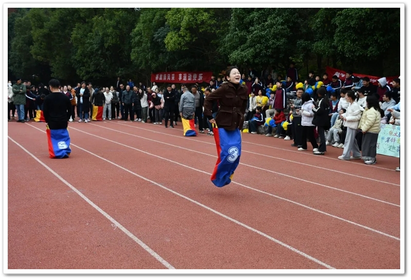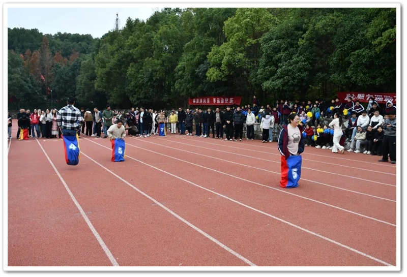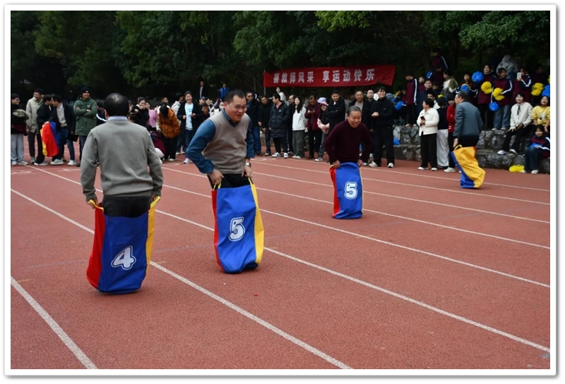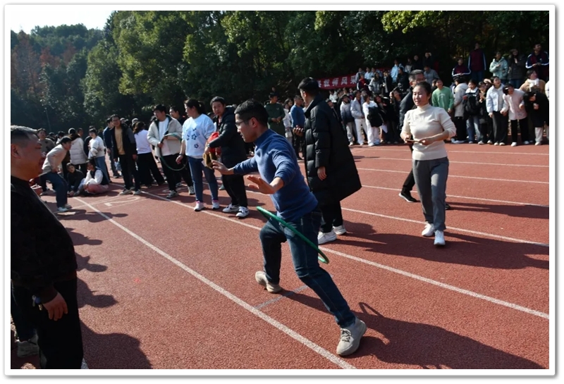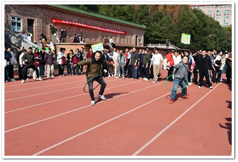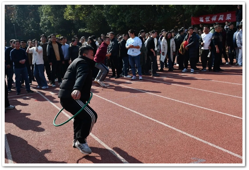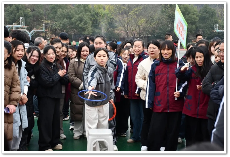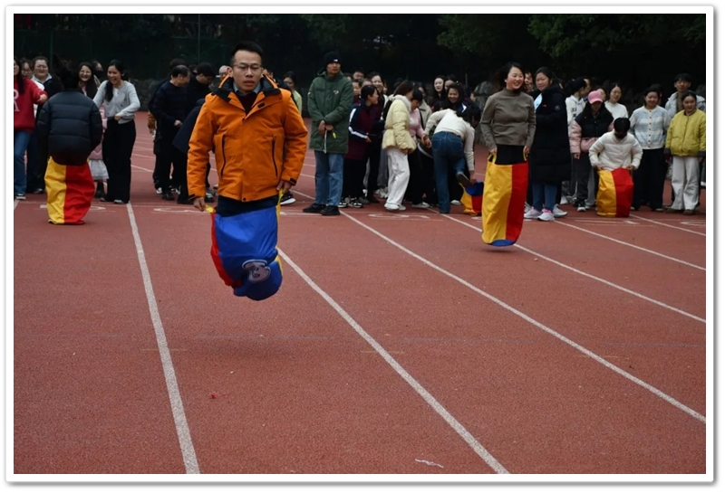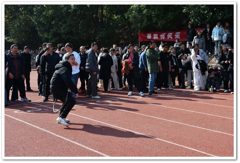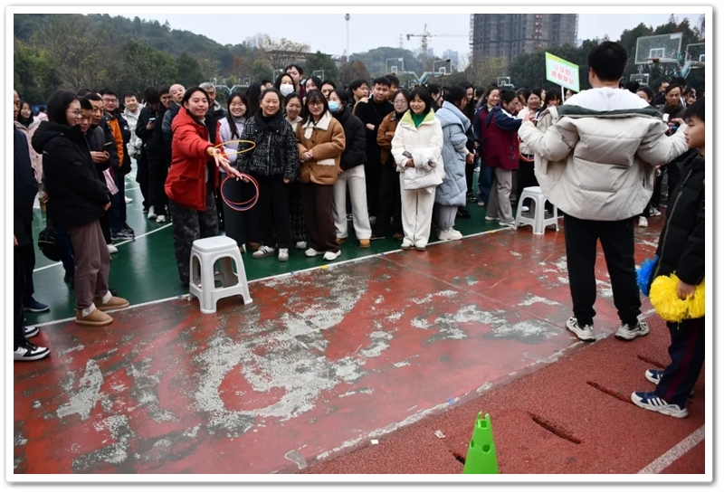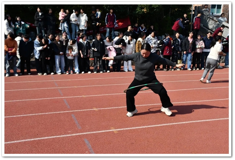赛场上,各项趣味项目亮点纷呈、妙趣横生。“精准套圈王”既要眼准手稳,还要一点运气加成。老师们屏气凝神瞄准目标,每一次套中总要引发一场欢呼雀跃,实力与运气的碰撞让赛场氛围瞬间升温。“袋鼠跳”项目中,老师们身着布袋、手脚协同,找准节奏方能游刃有余,蹦蹦跳跳飞速前行。“摸石头过河”项目则将难度拉满,踩着道具石块稳步挪进,稍有不慎便会趔趄失衡,一个“连滚带爬”,引发全场欢笑;“腰缠万贯”项目考验着团队间的默契配合,一不小心就要撞个满怀;“螃蟹跑”项目要双腿顶着呼啦圈侧身前行,老师们手忙脚乱的姿态与奋力冲刺的模样形成鲜明反差,又让众人忍俊不禁……掌声与欢笑交织,运动场内俨然化作一片欢乐的海洋。