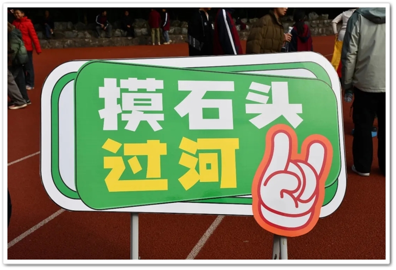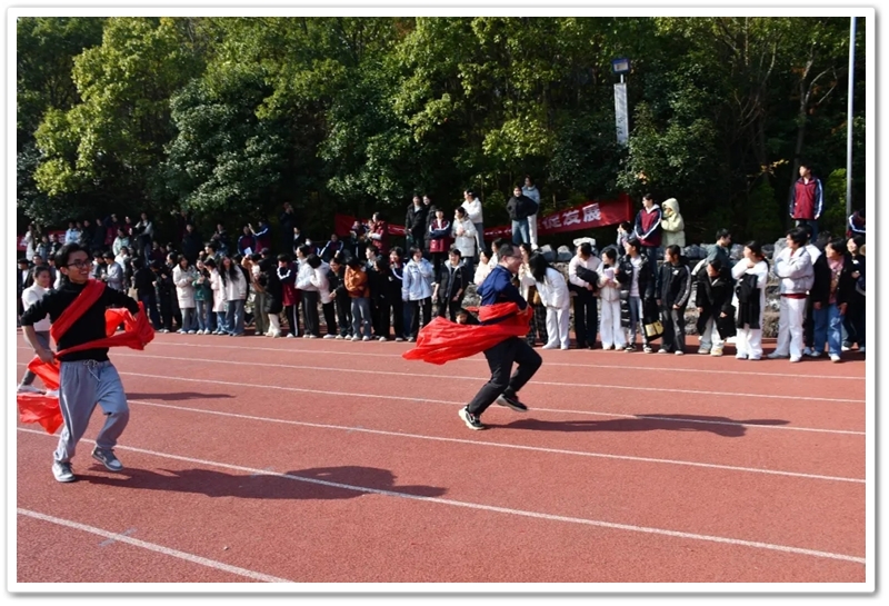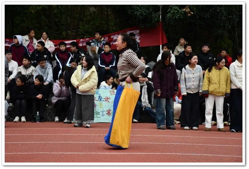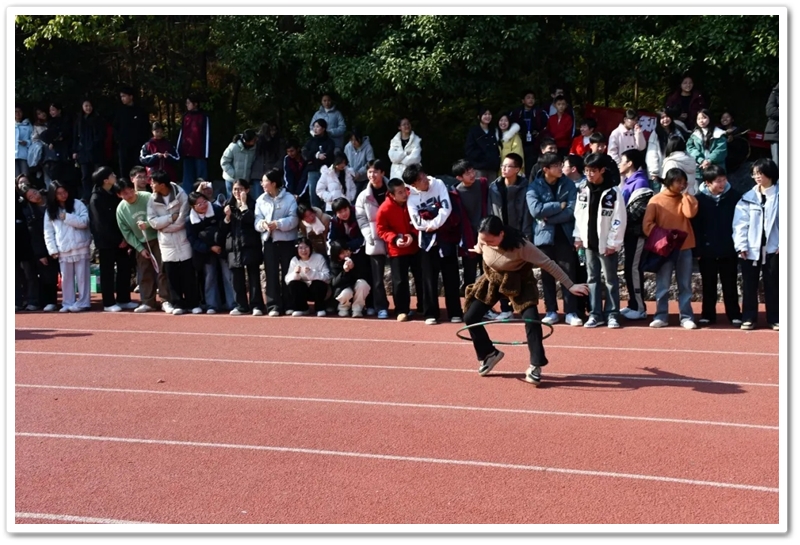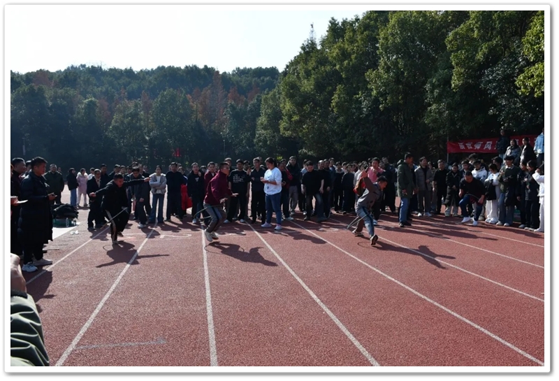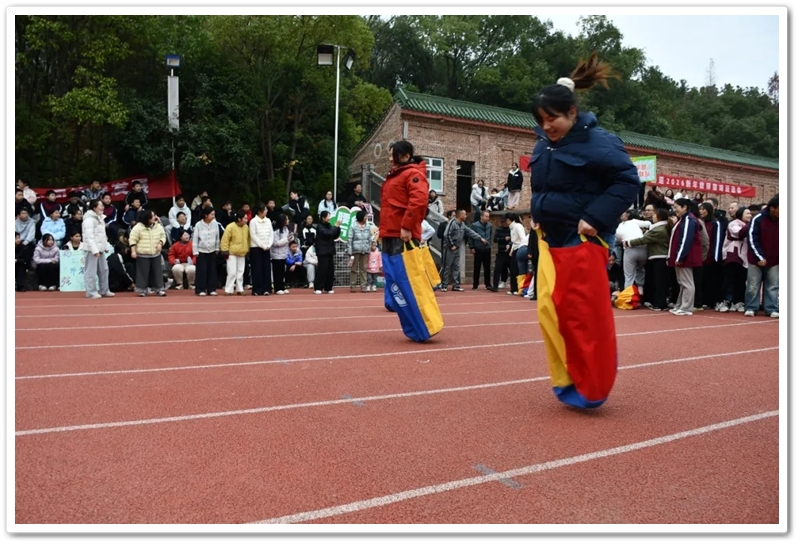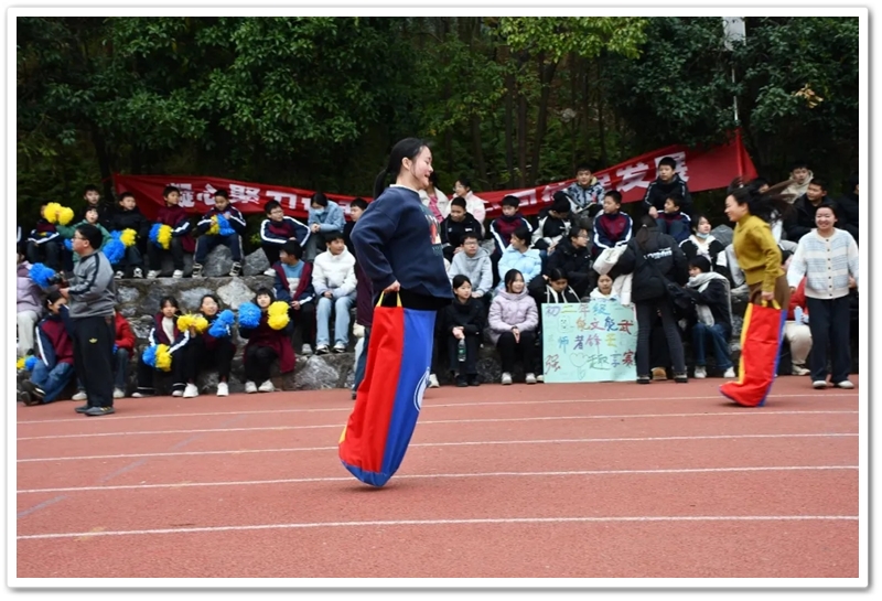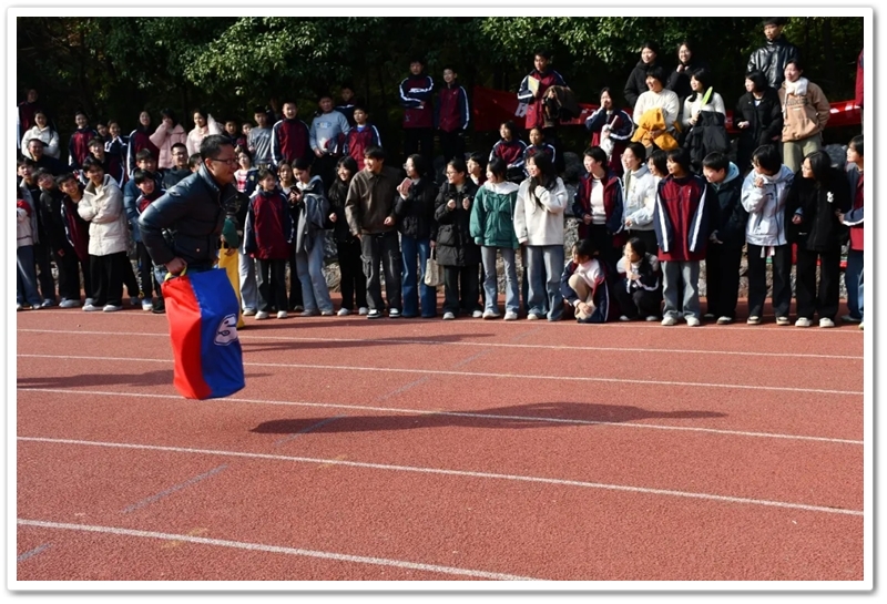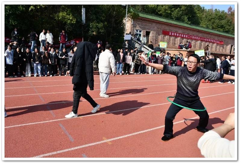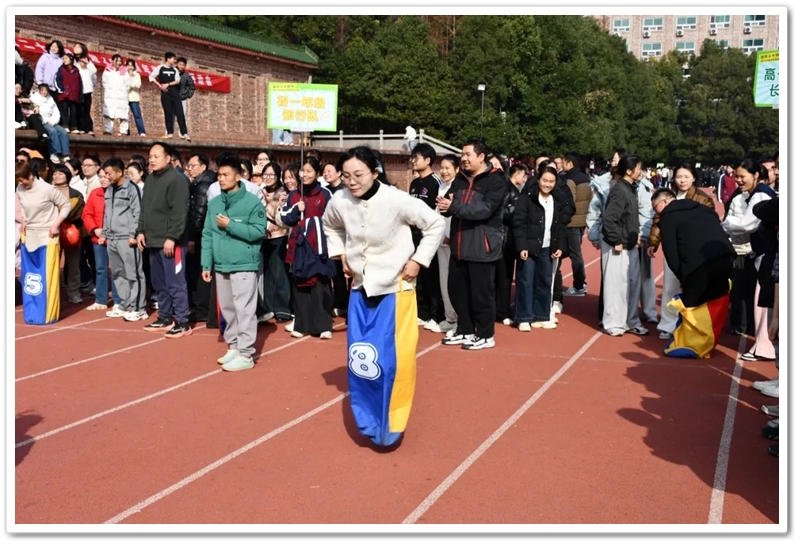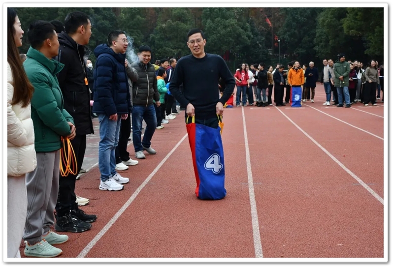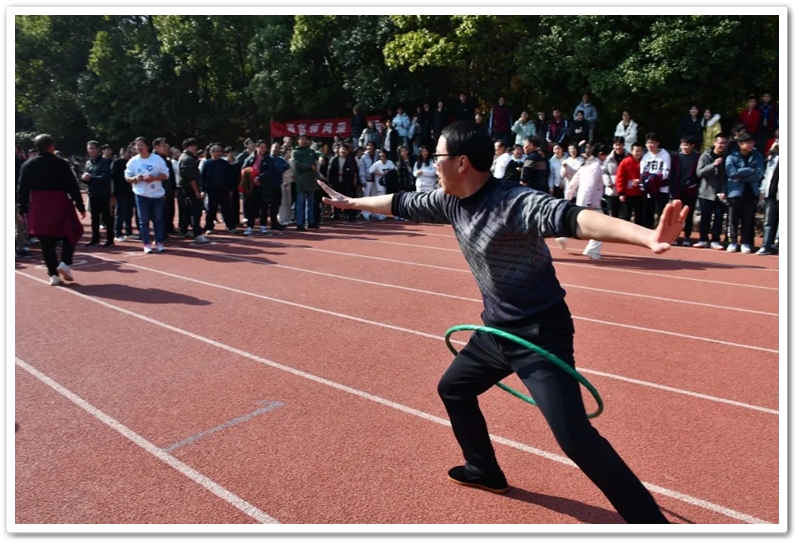 赛场上,各项趣味项目亮点纷呈、妙趣横生。“精准套圈王”既要眼准手稳,还要一点运气加成。老师们屏气凝神瞄准目标,每一次套中总要引发一场欢呼雀跃,实力与运气的碰撞让赛场氛围瞬间升温。“袋鼠跳”项目中,老师们身着布袋、手脚协同,找准节奏方能游刃有余,蹦蹦跳跳飞速前行。“摸石头过河”项目则将难度拉满,踩着道具石块稳步挪进,稍有不慎便会趔趄失衡,一个“连滚带爬”,引发全场欢笑;“腰缠万贯”项目考验着团队间的默契配合,一不小心就要撞个满怀;“螃蟹跑”项目要双腿顶着呼啦圈侧身前行,老师们手忙脚乱的姿态与奋力冲刺的模样形成鲜明反差,又让众人忍俊不禁……掌声与欢笑交织,运动场内俨然化作一片欢乐的海洋。