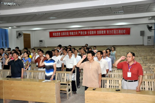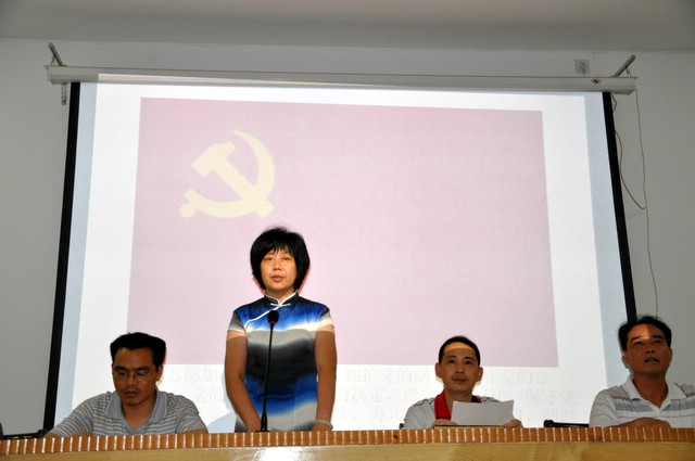 7月1日晚上7点30分,我校党支部在报告厅召开“创先争优暨庆‘七·一’重温入党誓词民主生活会”,70多名党员参加会议,会议由支部成员校团委书记刘生机同志主持。首先是重温入党誓词,全体党员面对鲜红的党旗集体宣誓,再一次理解入党誓词的真谛,牢记自己对党的誓言。接着,支部成员及各党小组组长纷纷上台作党员公开承诺,表示将在自己的本职工作岗位上为党旗争添光彩,为学校发展作出贡献。毛小波书记作重要讲话,要求全校党员齐心协力,积极参与到全党争先创优活动中来,立足本职岗位,发挥先锋模范作用,为学校实现创办三湘名校的目标贡献一份力量。最后,各党小组成员在会议现场通过公开投票方式,推选出8名校优秀党员。