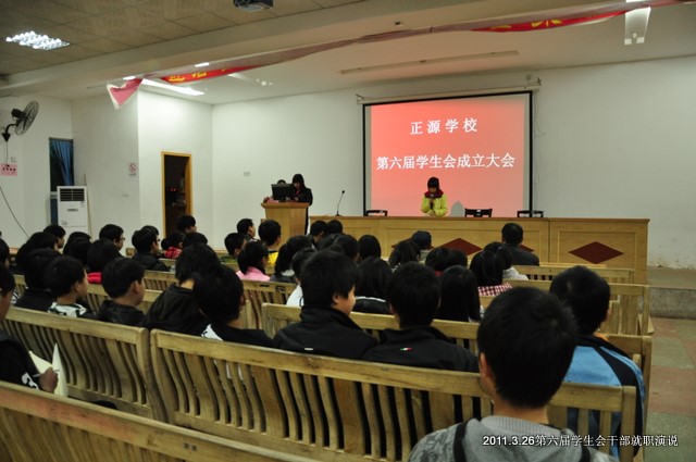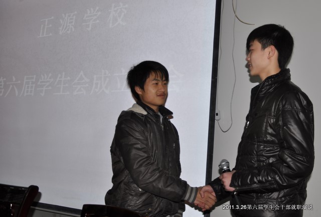 上届学生会主席谢雄向本届主席龙伟伟进行了简单的交接仪式,祝贺他们光荣当选,预祝他们旗开得胜,马到成功!龙伟伟豪情满怀地表示,向学生会老干部学习,不辱使命,继续开创学生会工作的新局面。