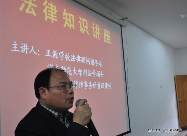 4月9日下午,在学校报告厅,我校常年法律顾问、法学硕士、湖南业达律师事务所资深律师谢冬春为初中部500多个学生代表做了一场精彩的法律知识讲座。主要内容包括:法律与学校规章制度的关系;未成年人的刑事或民事责任;中学生怎样预防违法犯罪等问题。谢律师还结合《中华人民共和国治安管理处罚法》提出了要树立法律意识,洁身自爱,学会自我保护的要求。今天的讲座深入浅出,获得师生们的一致好评。最后,德育处张红平主任对讲座做了总结。