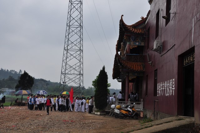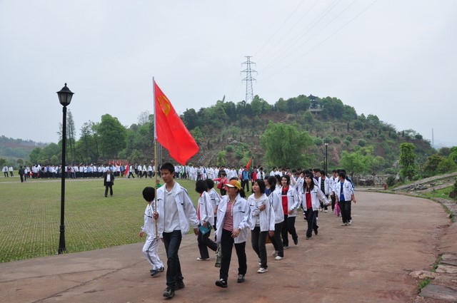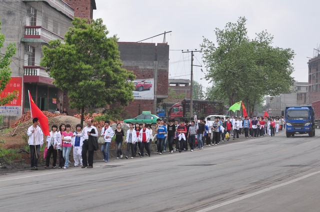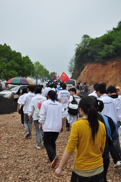 上午八点半,师生们排着整齐的队伍,浩浩荡荡从西门出发,过五里牌、三桥村再转上107国道,一路上,彩旗招展、欢声笑语,十点钟到达目的地——盘古庙。