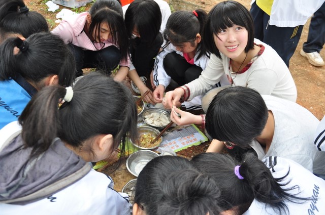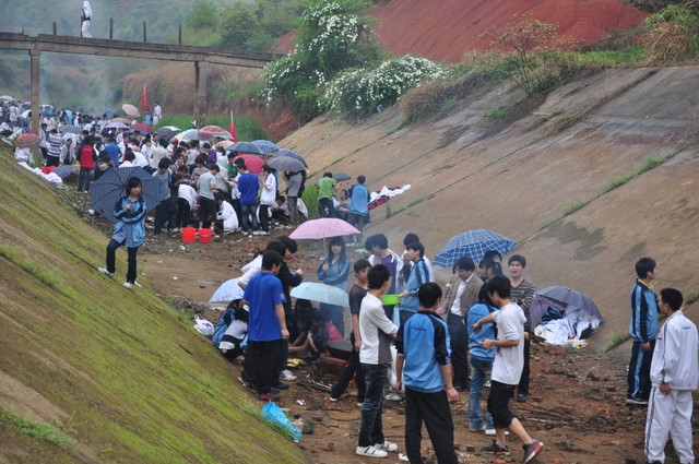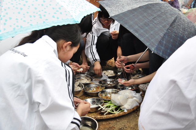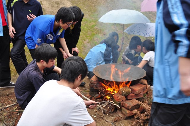 为了不攘扰佛门净地,各班选择了盘古庙对面山麓的渠道上进行野炊。这时,忽然下起了蒙蒙细雨。同学们冒雨垒灶生火、包饺子、煮面条,不亦乐乎。