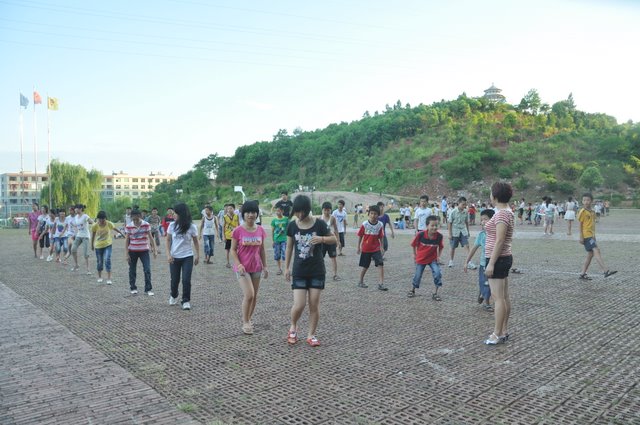 每天下午6点,参加夏令营活动的孩子们就很自觉地来到学校的操场上,这里有两人三足跑、击鼓传球、夹气球比赛、拉网捕鱼、踩气球比赛……,只要来到学校广场,总有一样游戏吸引孩子们参加。有的两两手夹着手,背顶气球,快速向前奔跑;有的在老师的带领下,玩拉网捕鱼的游戏;有的在跳皮筋……。虽在盛夏,但学生们参加活动的热情非常高涨,没有一个因为天气炎热而退出,都是踊跃地、自主地参加到活动中来。