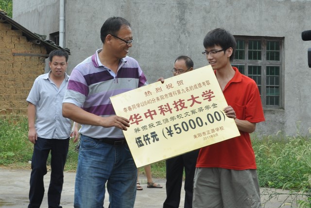 在2011年高考中,正源考生李春同学以640分耒阳市理科第九名的成绩考入华中科技大学。9月2日,李春家长在本村宗祠举行答谢宴。当日,罗校长率领高三年级主任江宗斌以及班主任老师、科任老师等一行赴遥田镇灯塔村祝贺并为其颁发了5000元文军奖学金。在宴席上,李春一家及其亲朋和族人盛赞williamhill威廉希尔亚洲官网教学有方,并祝williamhill威廉希尔亚洲官网越办越好。