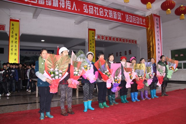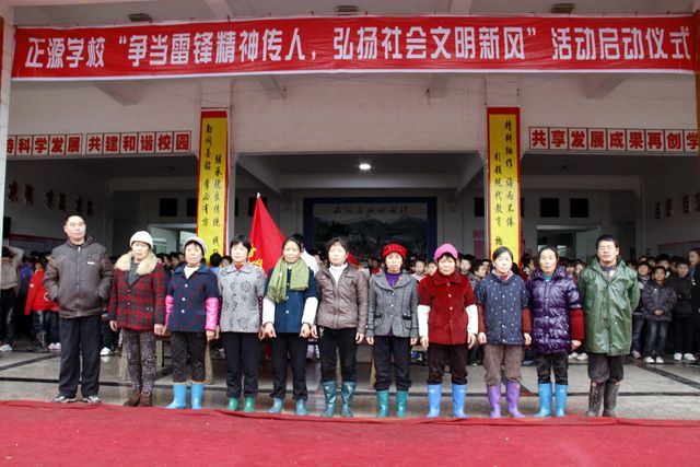 出征仪式由学校团委书记周文根主持,党支部书记毛小波作了讲话,他向同学们讲述学雷锋的时代意义,号召同学们向雷锋学习。在出征仪式上,志愿者们向学校的保洁员敬礼、献花,表达感谢和祟敬之情。接着,校广播站几名播音员朗诵了赞美学校保洁员的诗歌《敬礼,正源的美容师》。