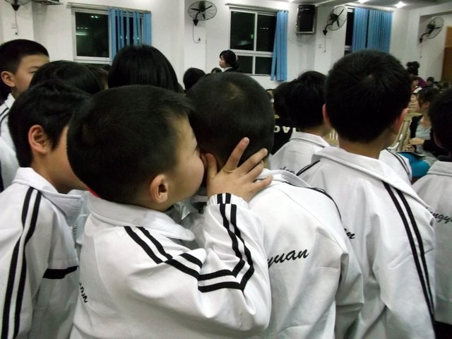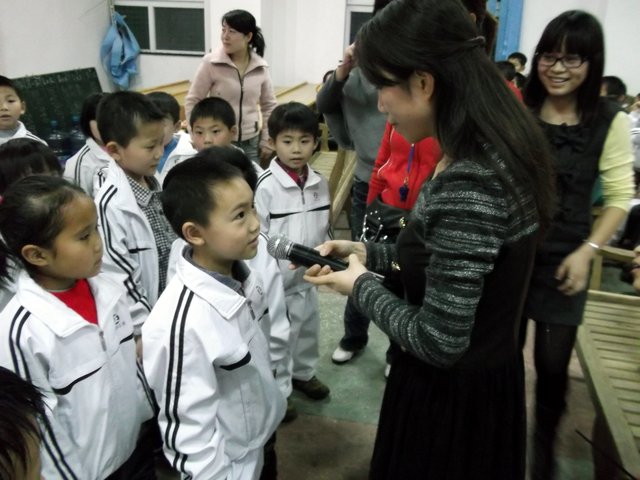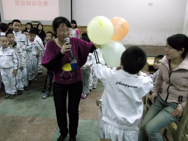 英语老师李老师很熟练地通过和同学们的互动游戏把大家带到学英语的氛围当中。接着正式进行英语竞赛小游戏。每个班派出6名选手玩英语单词接龙,单词卡片先由三年级的小朋友拿着,第一个小朋友看了读出来就传给下一位,一个接一个读,最快读完而且读得准的那组获胜,获胜的班级可得到气球。在比赛中小朋友们唱起了英文歌,又唱又跳,气氛极其热闹。