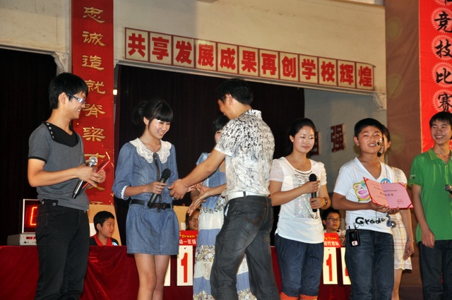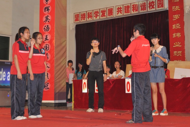 英语竞赛在学生们的欢呼声中拉开序幕,六年级、初一年级、初二年级、准高一四个组展开角逐。在团体展示第一个环节中,第四组上来的三个学生表演的情景剧生动活泼、风趣幽默,台下的学生也看得尽兴,不时笑声阵阵。在接下来的环节中,每组的选手都是“八仙过海各显神通”,“必答题”时的沉着、“风险题”时的谨慎、“背诵题”时发挥团体整齐有力的力量、“猜词游戏题”时紧张又不乏机智。选手们清晰的发音、自然的表达、娴熟的口语能力和自信的微笑,再加上各具特色个性化的表演,充分展示出他们对英语学习的热爱和执着,同时也展示了他们昔日的努力和对未来的憧憬。
