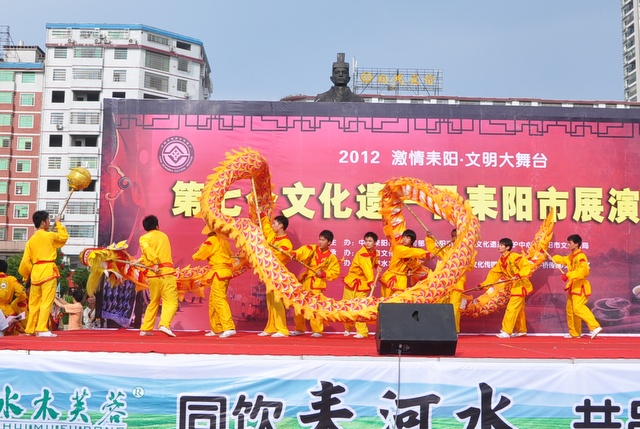 2012年6月9日,是我国“第七个文化遗产日”,当日下午,由中共耒阳市委宣传部、耒阳市非物质文化遗产保护中心、市文广新局主办的耒阳市文化遗产展演演专场在发明家广场隆重举行。我校《龙腾盛世》为展演活动拉开序幕,在艳阳照耀下,活灵活现的金色长龙格外夺目,得到现场观众的一片喝彩。