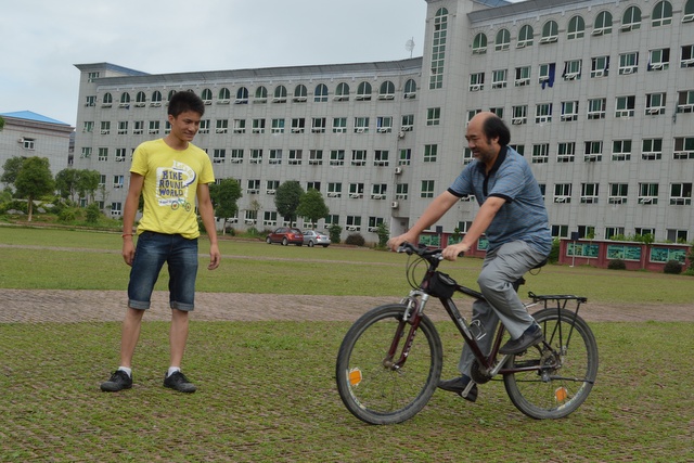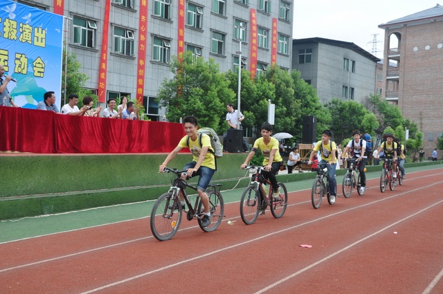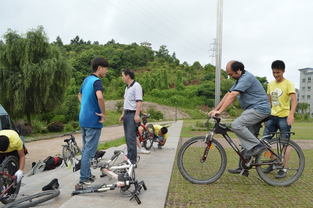 “好汉欲试当年勇”--罗校长骑上学生的单车在学校广场打起了小圈圈。