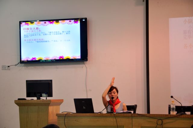 下午,湖南农业大学弟子学校大队辅导员陈曦同志对大家进行培训授课。她在少先队礼仪、少先队活动等各个方面进行了系统、全面的讲述。为了使大家能深刻地记住她讲授的内容,现场进行了中队活动模拟表演。