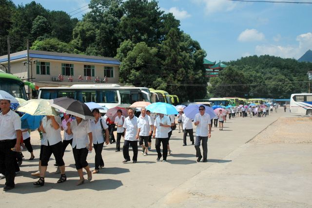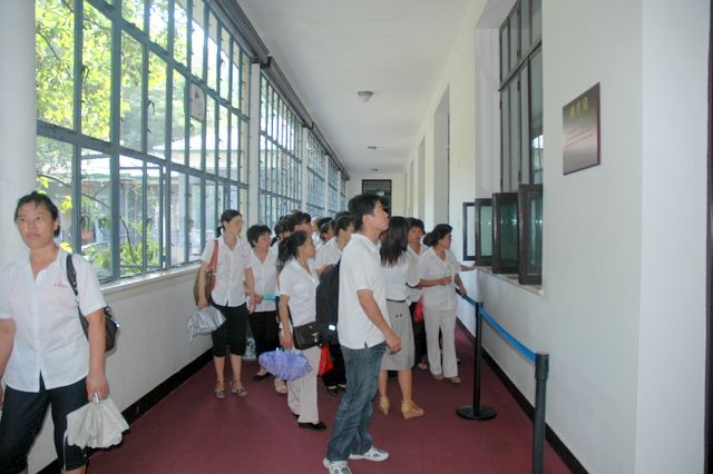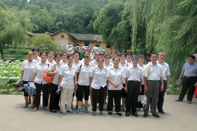 韶山的最后一站是参观滴水洞。导游介绍说,主席当年曾在滴水洞的楼里住了11个晚上,其实滴水洞也不是一个洞,而是因为毛主席当年在信中隐讳提到他在“西方的一个山洞”里住了几天,因而就叫滴水洞了。旁边的水库还是主席曾经游泳的地方呢。导游介绍各个房间,毛主席住过的,开过会的,浴室,卧室,台球厅……参观滴水洞之后,很多工人不顾天气的炎热和身体的疲劳,徒步登上600多级石阶的毛主席祖坟处参观、跪拜、祈祷,希望能沾点灵气带回家,保佑后代有出息。