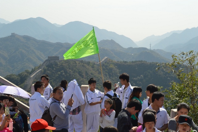 “不到长城非好汉”,登上八达岭长城,是我们这次励志的重要一站,10月2日早晨五点多钟,同学们便从宾馆出发,乘地铁1号线经西单转乘4号线到达北京北站赶乘当日第一趟列车,车站值班领导,看到我们这个庞大而亮丽的团队,格外眷顾,单独让我们提前候车和上车,九点二十分到达八达岭长城,登长城之前,大家在小广场合影留念,尔后迫不及待融入到人流之中向长城进发,刚进入长城,我们的校旗被迫取下,幸好同学白净的校服格加之旗手们高举的竹旗杆也格外耀眼,以至于被人流挤散的同学随时都能辨别主力队伍的方位。顺着凹凸不平,而且非常光滑的青石台阶往上走,不一会,好多游客显得有些吃力,不时站在城墙边休息。而正源的同学们却是那么精神焕发,在陡峭的长城上有的人走到游人稀疏的地方甚至还小跑起来。站在高高的烽火台旁,往下一瞧,可以看到脚下的长城蜿蜒起伏,气势磅礴,雄伟壮观如一条不见首尾的巨龙在绵绵山岭上翻滚爬动,同学们兴奋不已,突然有一种自豪的感觉,他们说,站在长城上,亲手触摸坚如磐石的城墙,仿佛感觉到了历史的心跳......有的同学还说,太震撼了,太不可思议了,在那么不发达的古代社会,我们的祖先竟然能创造如此伟大的长城,尤其在这么陡峭的高山之上,那些巨大的石头又是怎么移上去的?一些同学还说,可以想像,当年建设长城之艰难,相比他们,我们仅仅是攀登长城,何敢再言“辛苦”二字。中午时分,大家在长城上合影留念,并齐声抒发内心感言:“高山之巅,万里长城永不倒:凌云之志,傲视群雄看正源”。可见,这次学校组织的励志活动对同学们已经产生了深刻的影响。