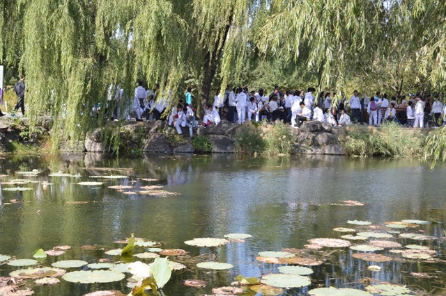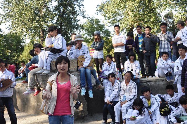参观清华大学是同学们励志之旅的核心区域第二站,10月3日下午,同学们分散用餐之后,陆续进入清华大学,不经意间,同学们来到了清华大学的荷塘边,著名散文《荷塘月色》中的场景原形,同学们打坐在荷塘岸边,细细观赏,品味朱自清当年那份心境,仿佛每一片荷叶上都在诉说着那份宁静和惬意。约莫半个小时之后,罗校长和那些耒阳学长们也到了,队伍集合一起越过荷塘石拱桥便进入“近春园遗址”,亦称“荒岛”。荒岛四面环水,岛上花木葱茏,绿草茵茵,水榭亭阁,掩映绿树丛中。同学们沿着平整的小路,来到了一处怪石堆砌四周的干涸池畔,或站或坐,听取北大学生潘军、清华大学在读研究生谭树龙、本科生黄一挥、人民大学在读研究生贺佐琪、中央财政大学在读研究生谢幽篁、中国政法大学在读研究生周芙蓉以及中国航空航天大学的谢正飞等介绍自己在求学路上取得的成功经验和学习方法,同学们深受启发,开始思考自己奋斗目标,尤其是坚定了自己刻苦学习信心和决心。