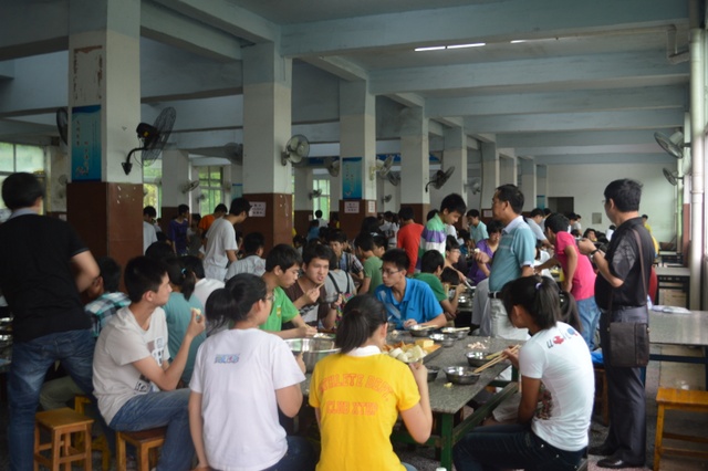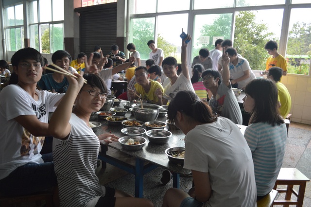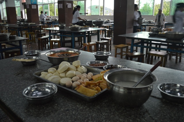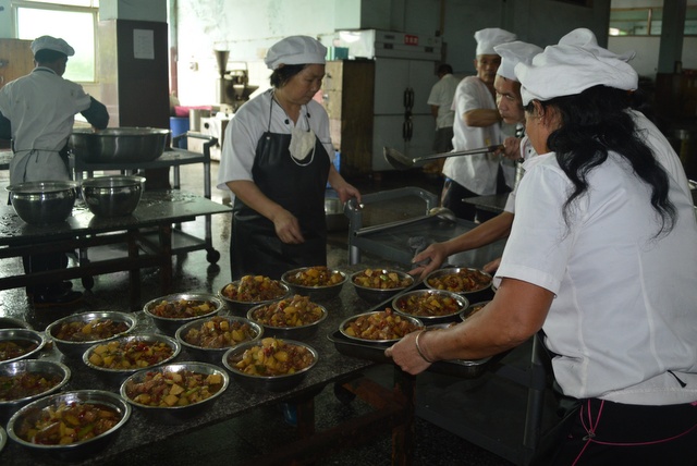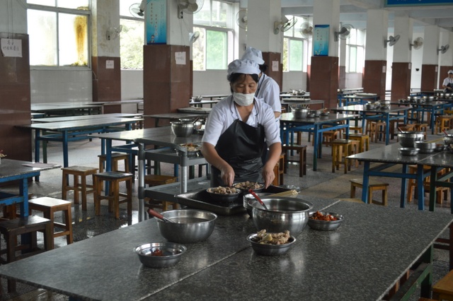高考期间,学校专门把第四食堂的两个餐厅改设为高考专用餐厅,考生统一按编席就餐。每餐摆设70多席。
