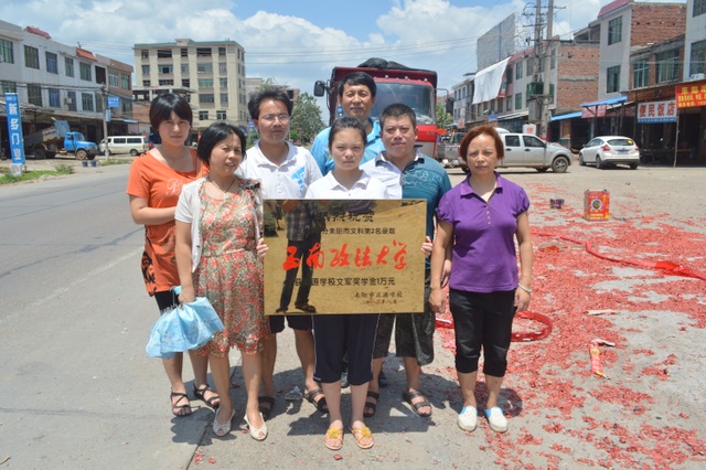 应家长盛情邀请,8月25日学校老师龙辉武、黄江楼、周雪梅、肖东飞、谷荣亮、谢鑫、唐志铁、郑德龙等人前往小水镇,为小水镇二位考入名校的正源学子送高考奖牌并热烈庆祝。龙玲同学高考分602分,高居耒阳市文科第二名,被西南政法大学录取,获我校“文军奖学金”10000元。郑周琪同学以587分的高分被华中科技大学录取,获我校“文军奖学金”3000元。
