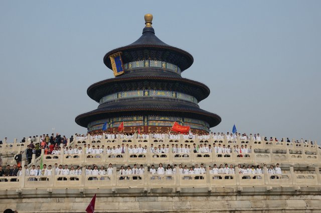 10月4日上午,williamhill威廉希尔亚洲官网北京励志行一行整队进入天坛景区。同学们在天坛之上合影,白色栏杆映衬白色校服成为天坛上的一道景观,引来游客们纷纷拍照。在天坛上,同学们主动与国外友人用英语交流,并巧遇一个国外学生团队。两个学生团队在一起用英语交流,并一起唱歌、跳舞,20多分钟后才依依道别。