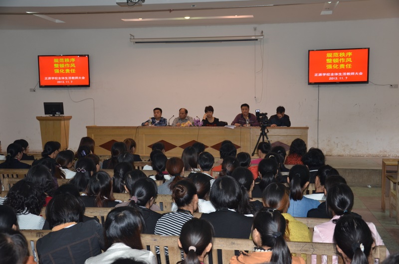 接着张红平主任做了主题报告。他围绕“秩序的规范”、“责任的强化”做了深入细致的讲解,用生动形象的例子,给生活教师享受听觉“盛宴”。张主任首先对本部门的历史进行回顾,对部门特色进行肯定。他说,当前面临的困难很多,家长投诉的例子也不少,我们只要用心工作,我们的劳动必然会受到家长的尊重和社会的好评。张主任说,他对安全值班不到位的现象感到甚为揪心;对内务卫生方面指导不到位的老师进行谆谆教诲;对不注重细节的现象如寝室毛巾衣物乱挂表示不解和质疑。张主任最后寄语各楼栋管理人员,深入到各个寝室当中,与学生做朋友,与生活教师沟通交流,协助他们解决一些实际问题,真正做生活教师的服务者。