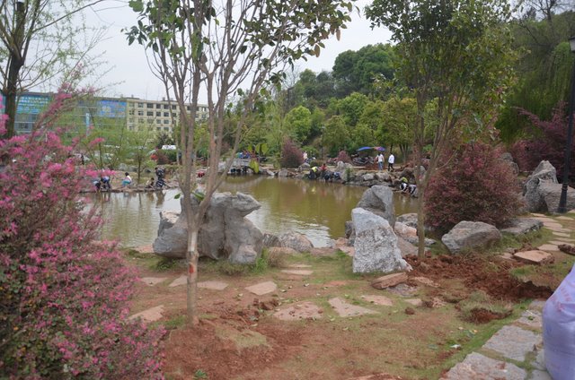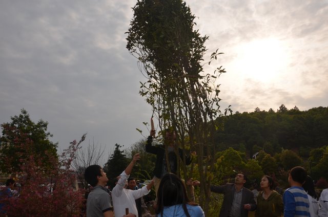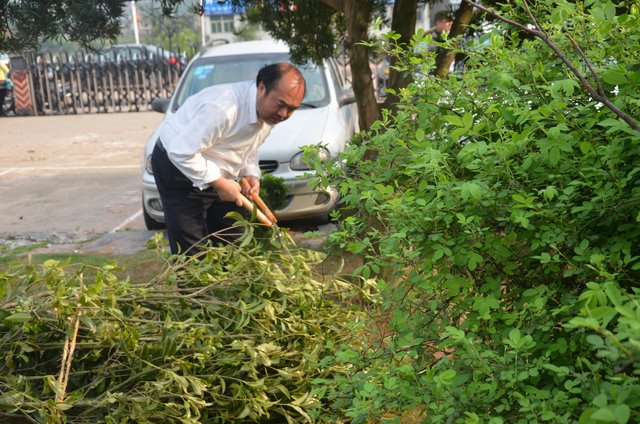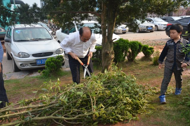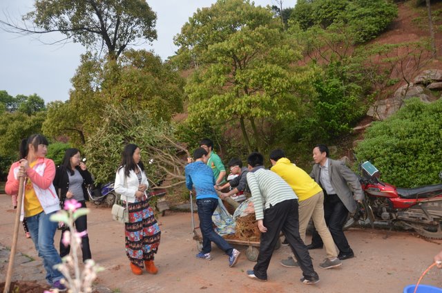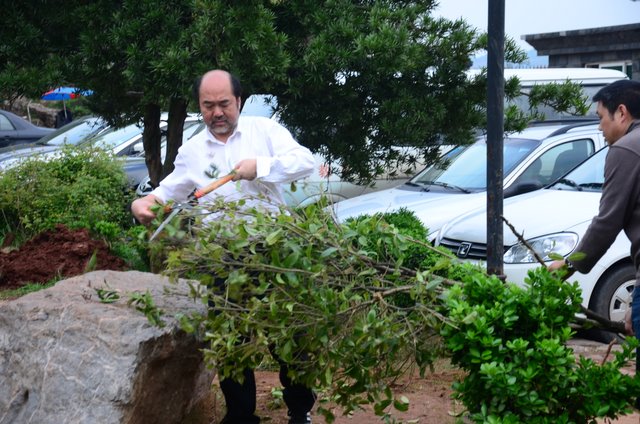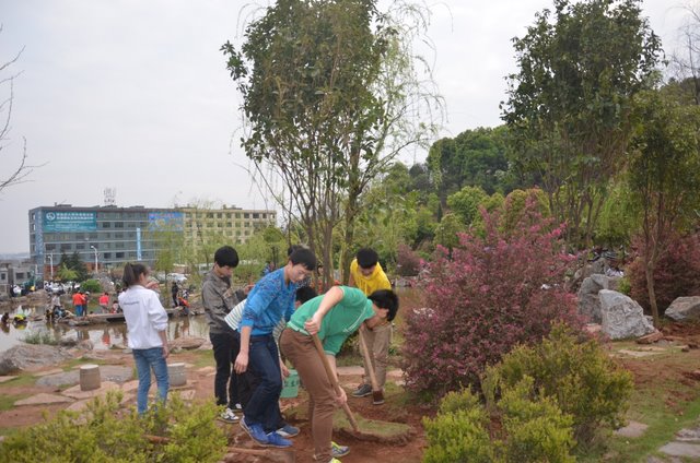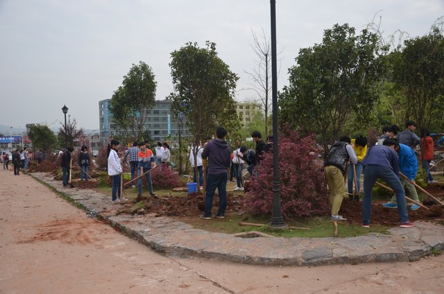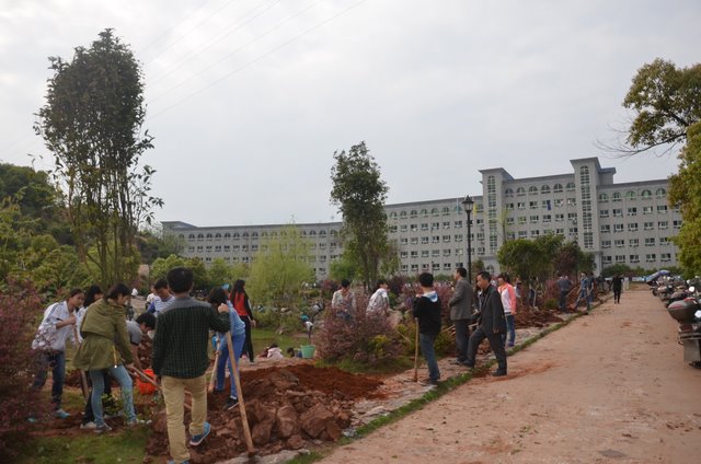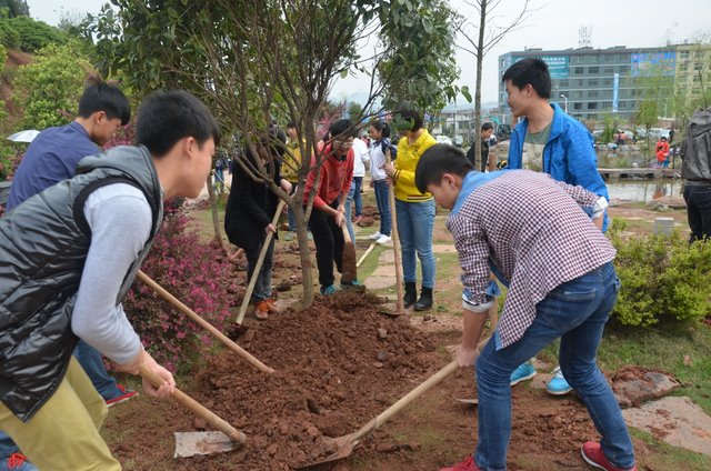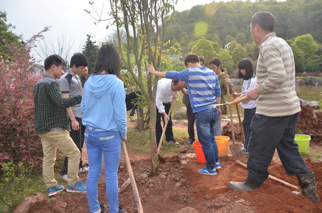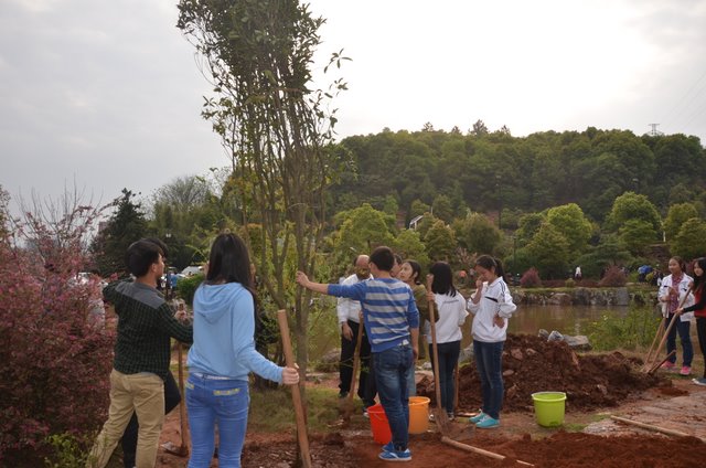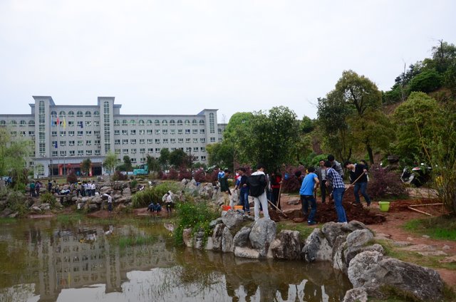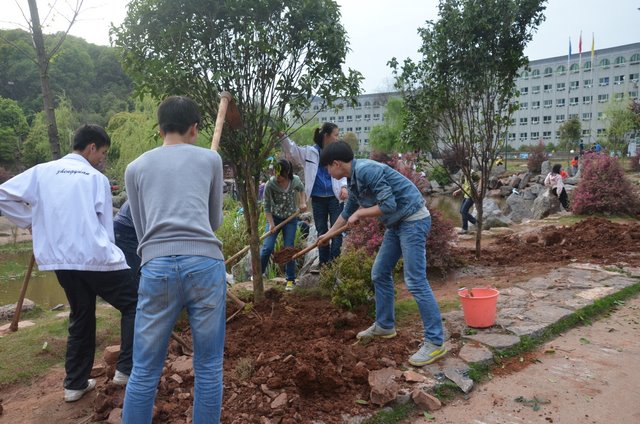 为扩大校园绿化面积,建设森林学校,下午,罗校长带领高一57班同学分成八个小组,在学校广场前的池塘周围种下近20棵桂花树。