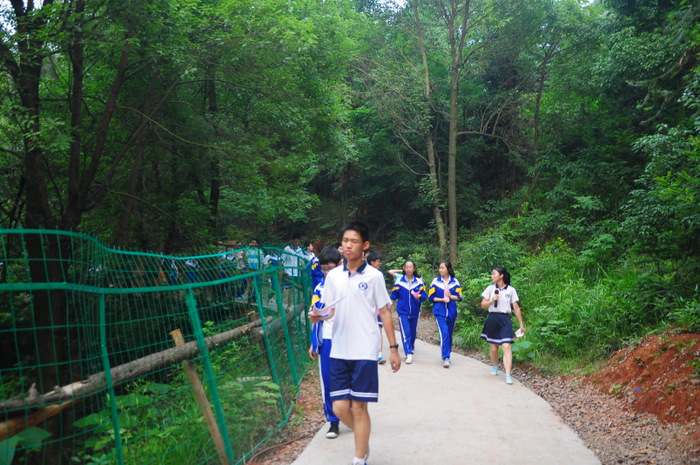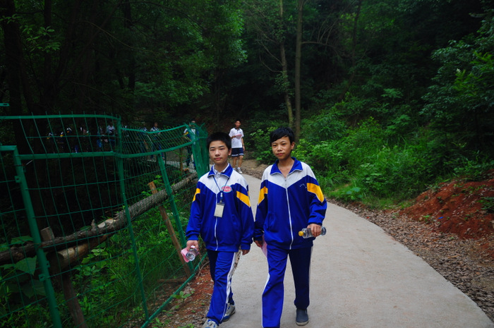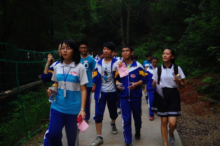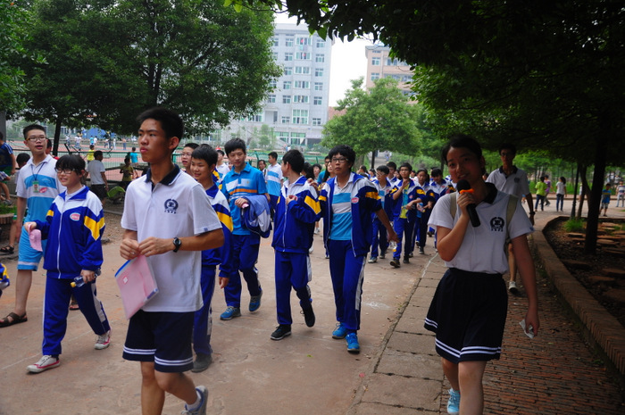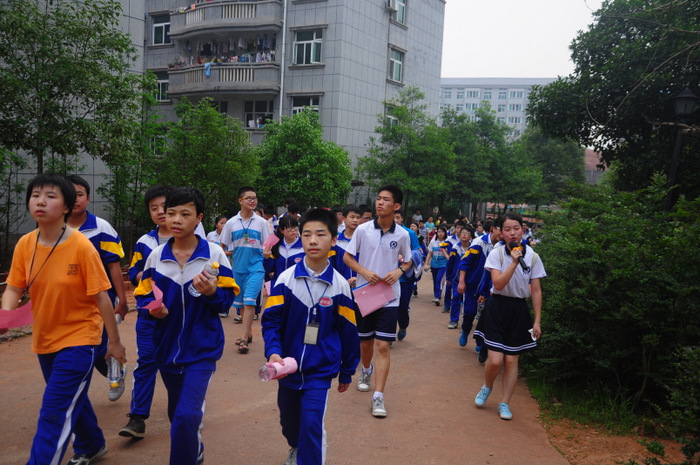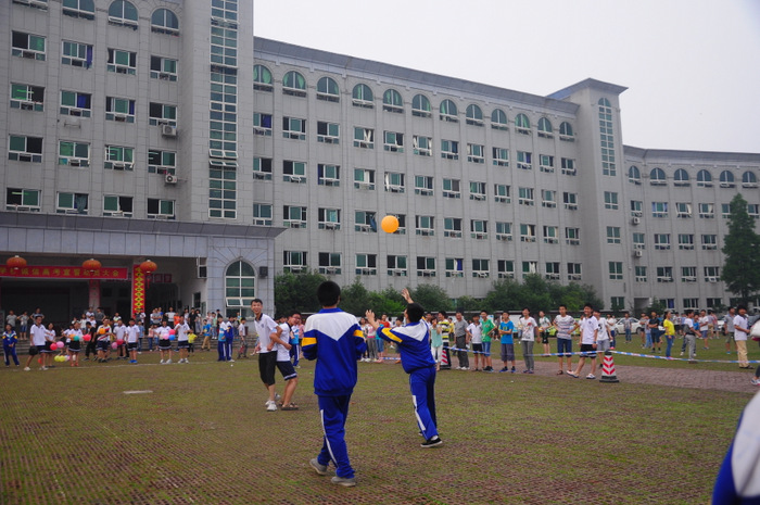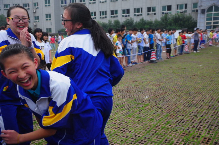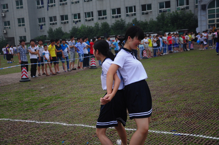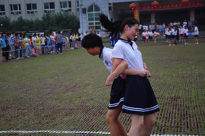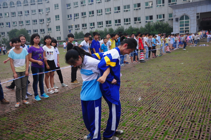 李主任带领同学们游览了东山,参观了校园,又来到学校广场开展联欢活动。活动项目为,我校高一学生一组,外校学生分两组,各组每两位组成一对(男女生分开),每对背靠背,里面夹一个气球,统一听口令起步,跑向前方指定界限,再夹破气球。然后第二队、第三队……哪一组先跑完为胜。有的配合比较默契,跑得比较顺利;有的跑着跑着气球飞了,或影响全组进度,或中途散伙;有的女生跑到了界限,却夹不破气球……场上欢声笑语,喜气洋洋。