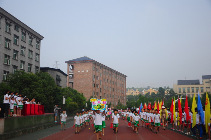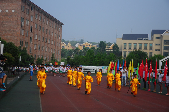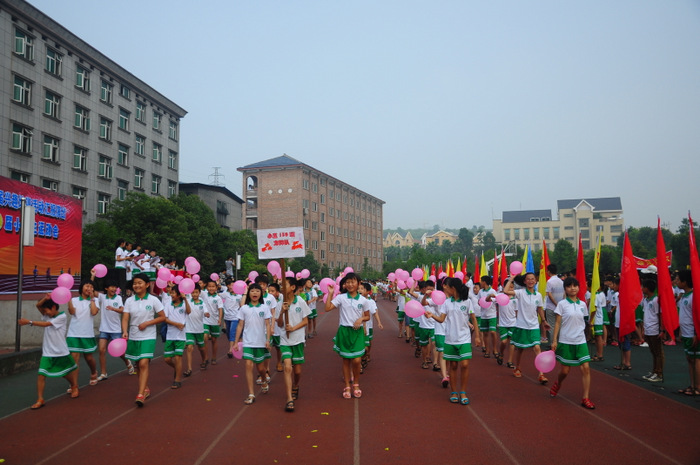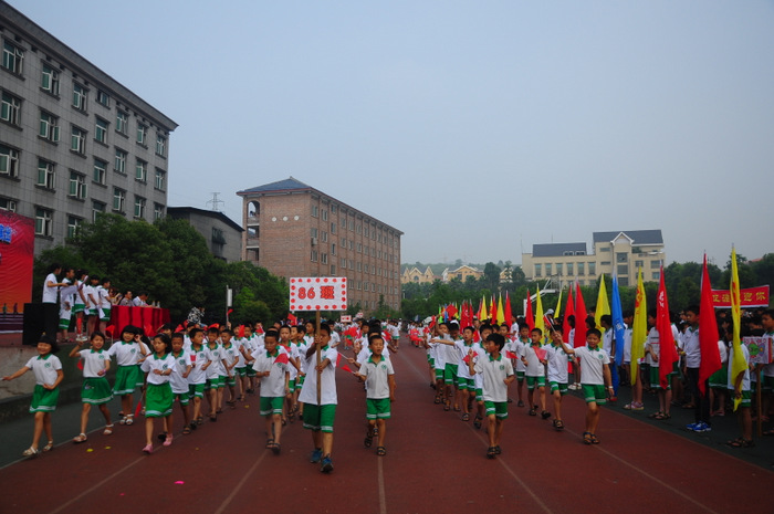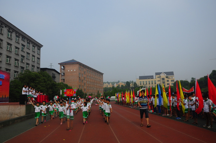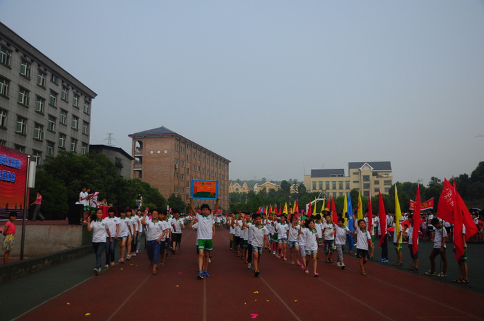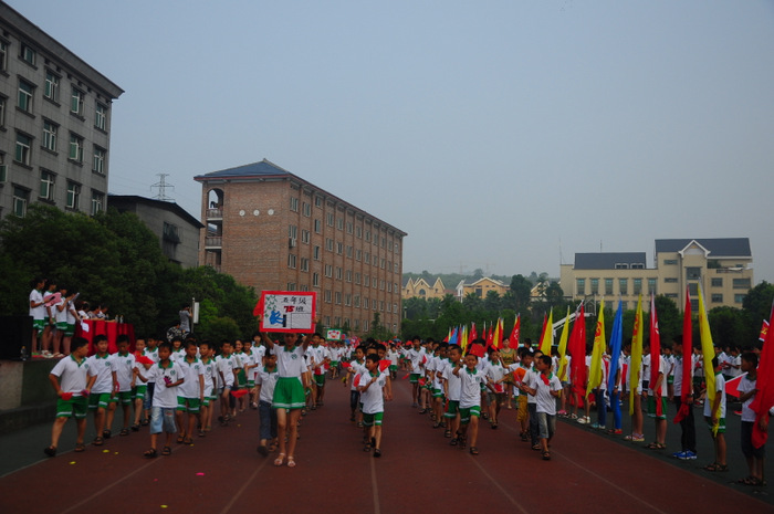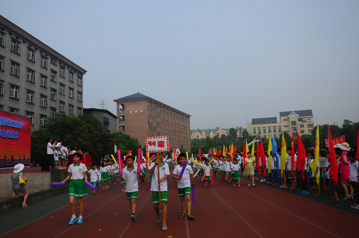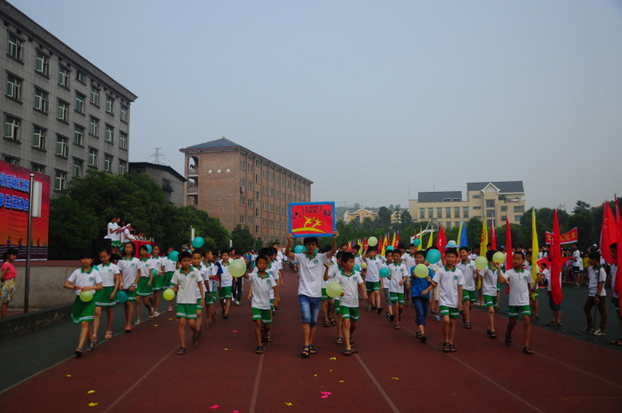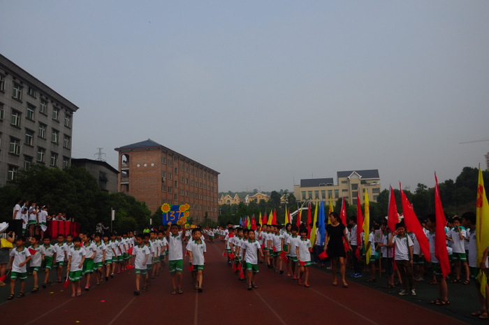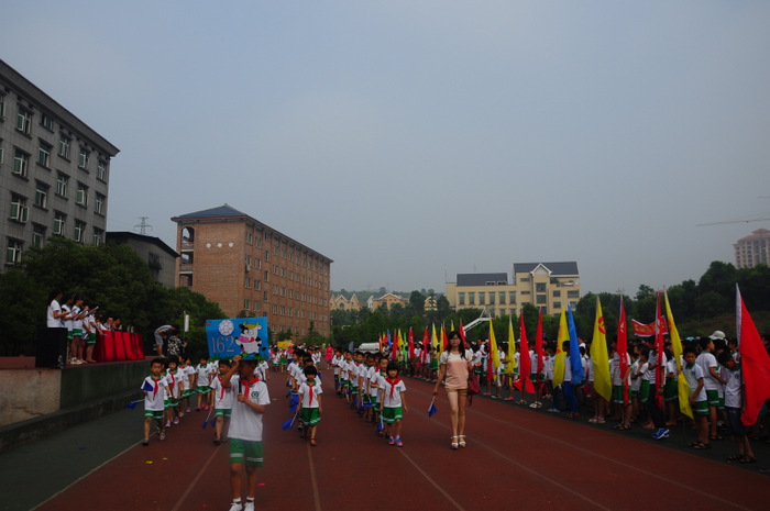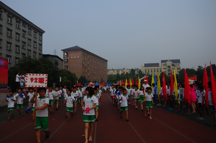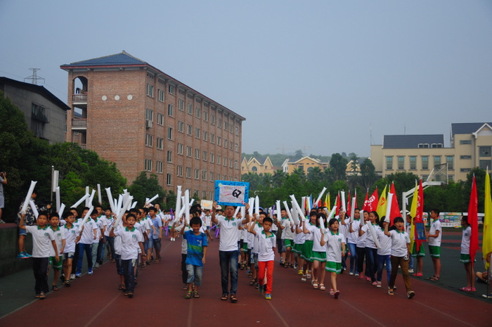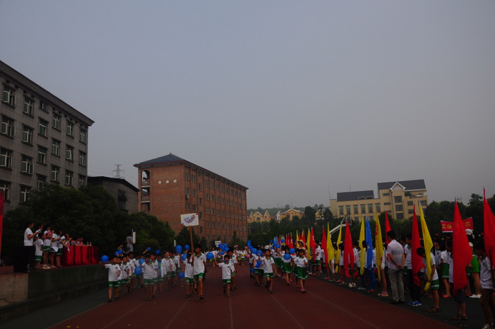 开幕式在小主持人稚嫩的声音中拉开帷幕。本次入场的共有100个方队:首先入场的是国旗队,而后是校旗队,彩旗队,接下来的是各具特色的表演队,最后是按从高到低的年级顺序,从小到大的班级编号顺序,各班依次出场亮相。他们手拿各色加油棒或气球或彩旗或“小手掌”,精神抖擞,兴高采烈,笑容满面,信心十足地走过主席台,嘹亮的口号喊出了他们对竞赛的自信和对艺术的追求。我们不得不感叹:“长江后浪推前浪,一代更比一代强。”