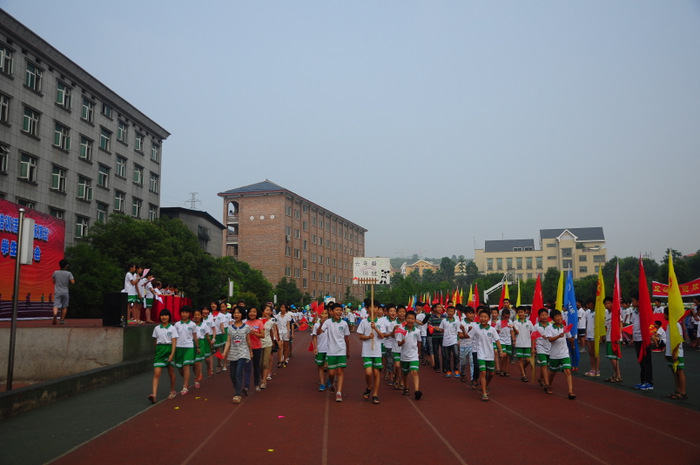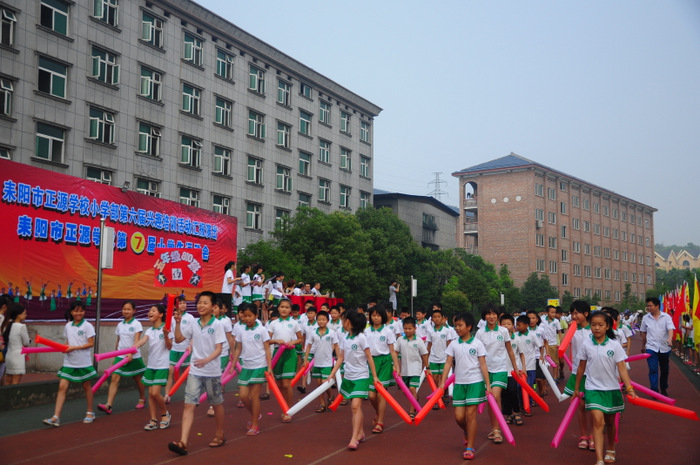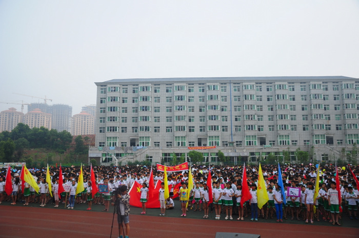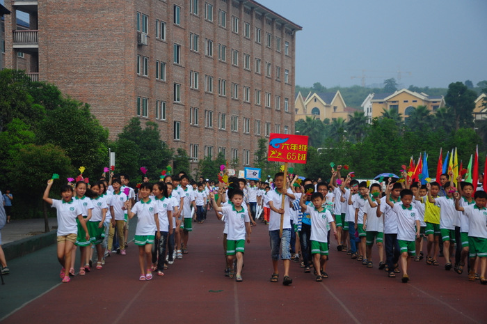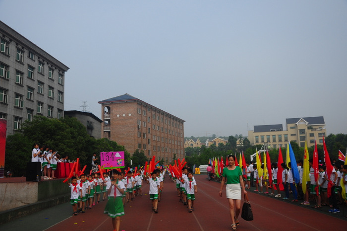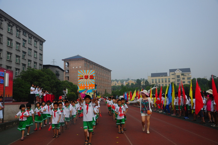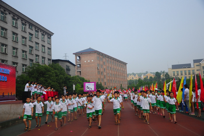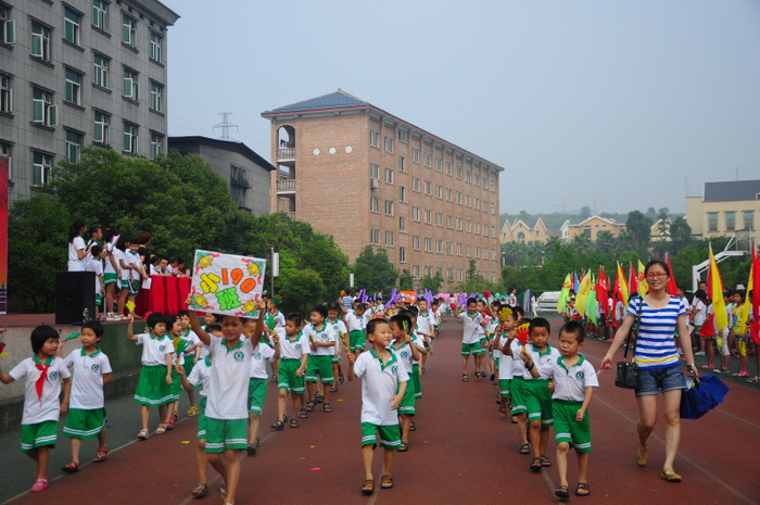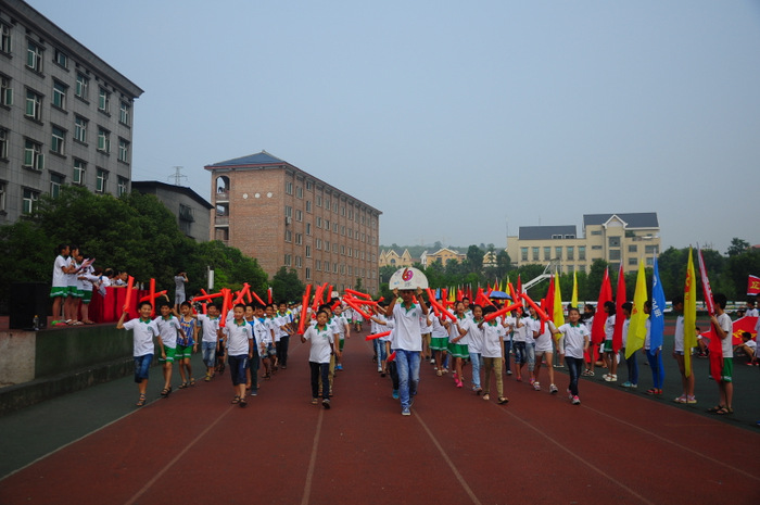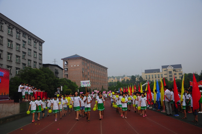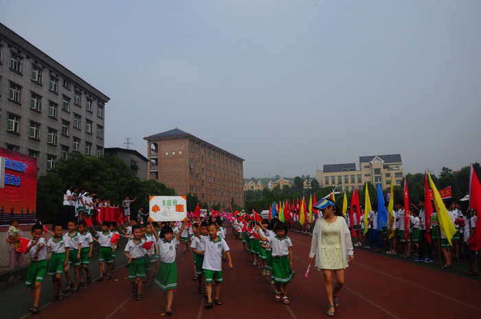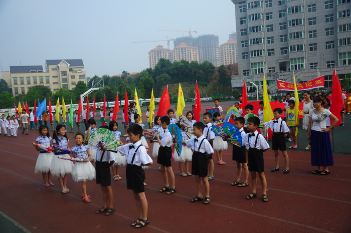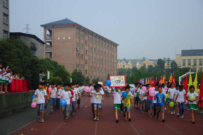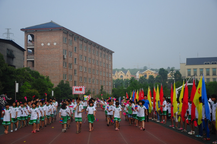 开幕式在小主持人稚嫩的声音中拉开帷幕。本次入场的共有100个方队:首先入场的是国旗队,而后是校旗队,彩旗队,接下来的是各具特色的表演队,最后是按从高到低的年级顺序,从小到大的班级编号顺序,各班依次出场亮相。他们手拿各色加油棒或气球或彩旗或“小手掌”,精神抖擞,兴高采烈,笑容满面,信心十足地走过主席台,嘹亮的口号喊出了他们对竞赛的自信和对艺术的追求。我们不得不感叹:“长江后浪推前浪,一代更比一代强。”