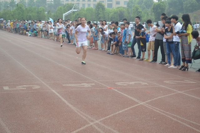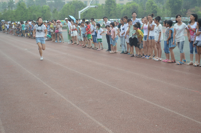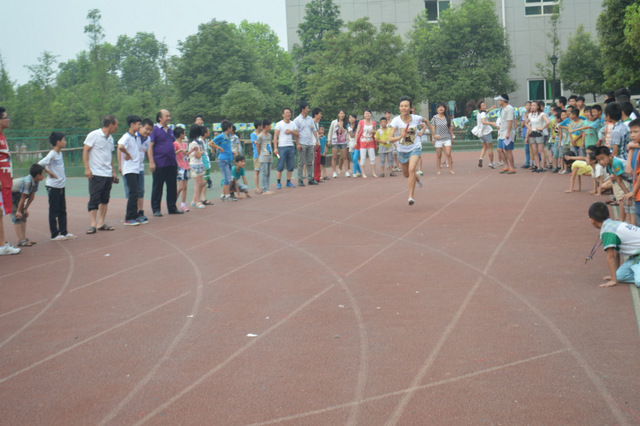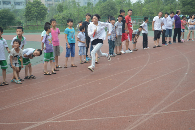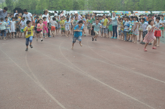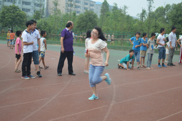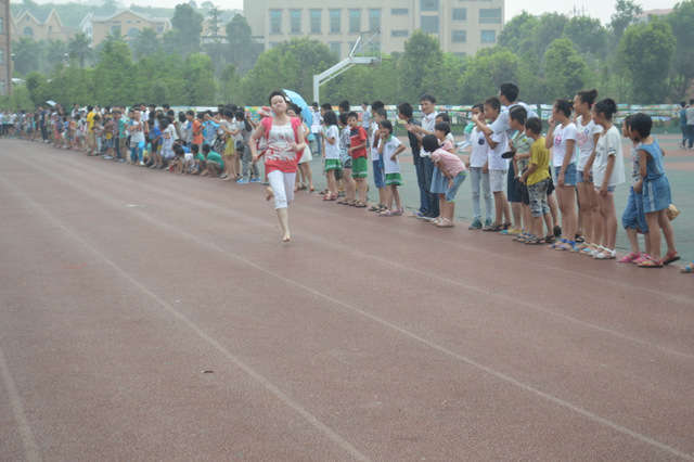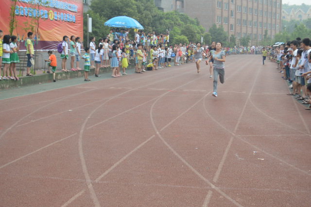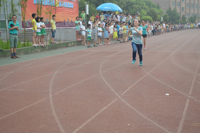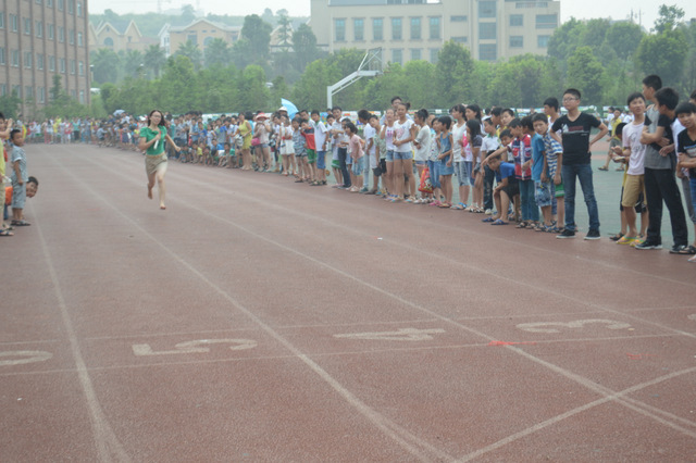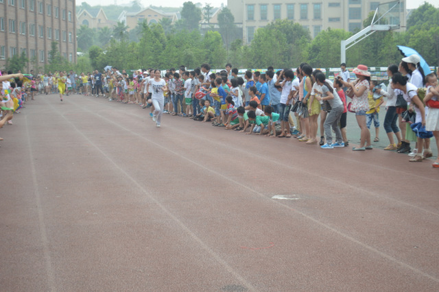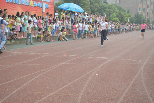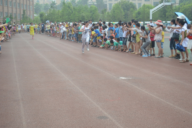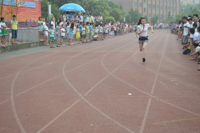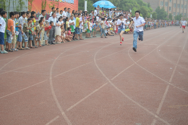 下午进行的是一、二年级小朋友的的10×100米接力赛和小学部文化课老师们的10×100米接力表演赛。老师们的接力表演赛分高低两段,即1-3年级段老师为一个组,4-6年级段老师为一个组。在老师们的这场表演赛中,有年龄达到40多岁的老师,也有刚出教坛的新秀,有文弱如风吹倒般的女“先生”,也有体格健壮如雄狮般的男“先生”。跑起步来,姿态万千。有人如雄狮猎豹,突涌而出,步风虎虎生威;有人虽聘婷多姿,然此时也顾不得体面了,甩脱了高跟鞋,在风中上演赤脚狂奔……那“优雅风姿”不得不让人感叹:“巾帼不让须眉!”老师们的精彩表演获得了赛道两旁的学生高声呐喊助威,加油声响彻正源上空。