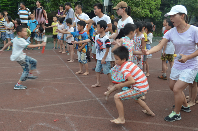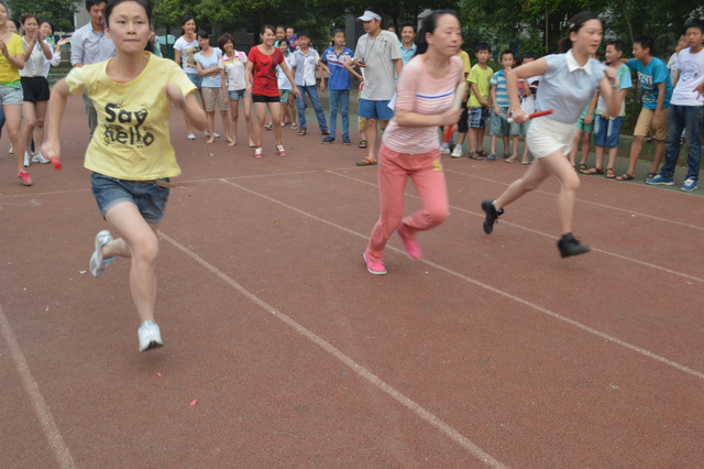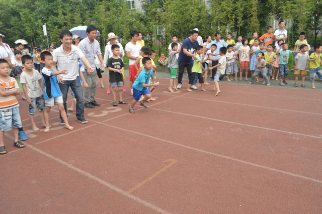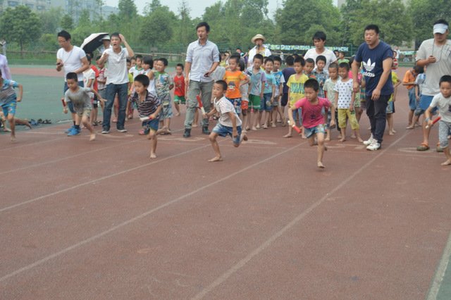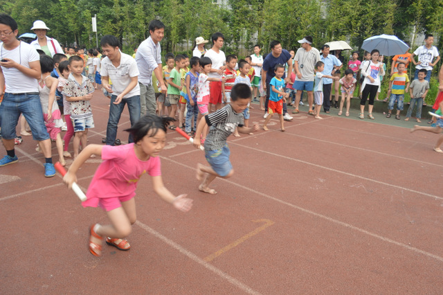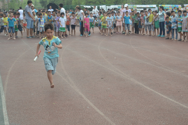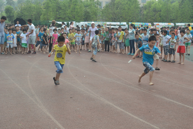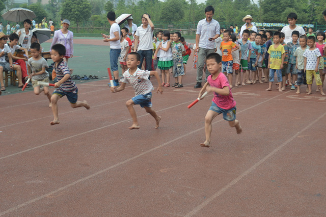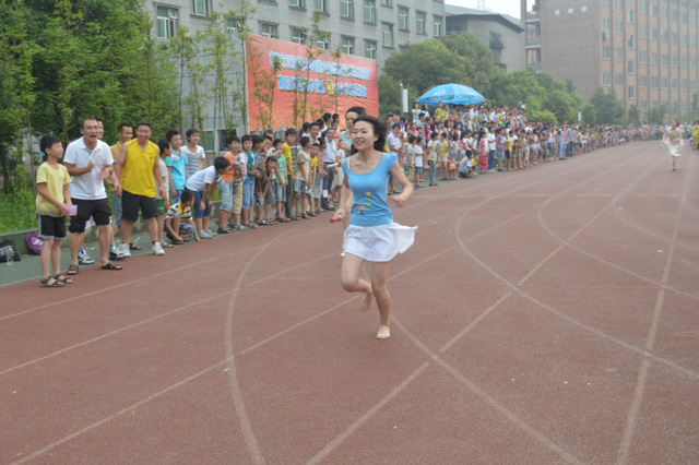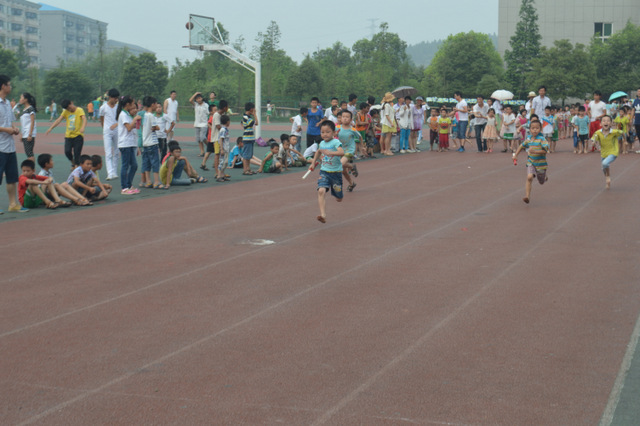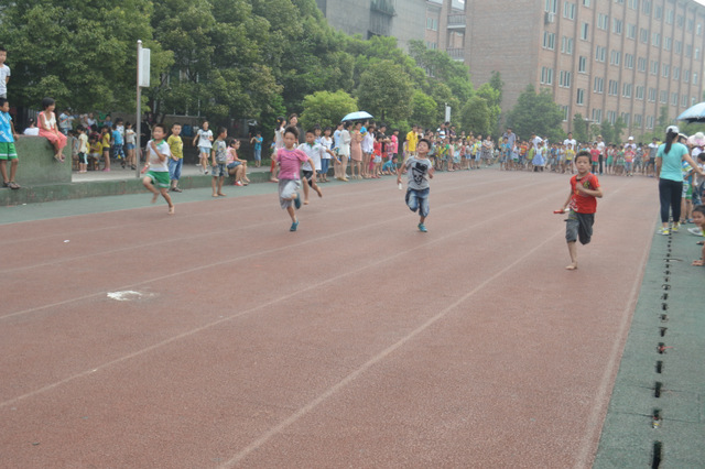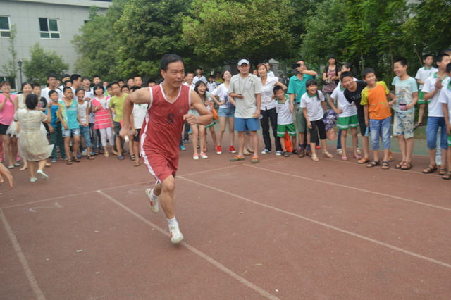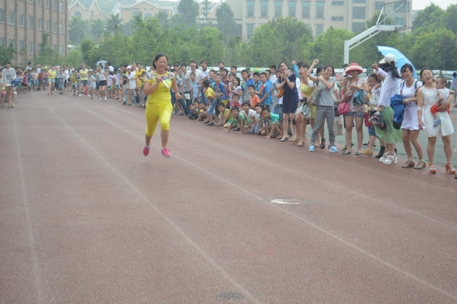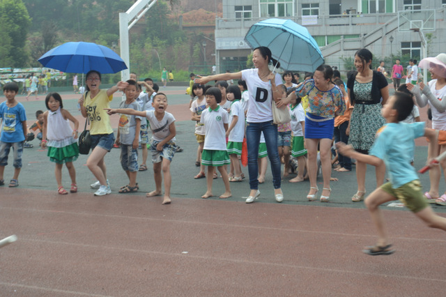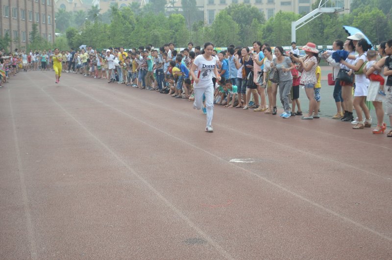 下午进行的是一、二年级小朋友的的10×100米接力赛和小学部文化课老师们的10×100米接力表演赛。老师们的接力表演赛分高低两段,即1-3年级段老师为一个组,4-6年级段老师为一个组。在老师们的这场表演赛中,有年龄达到40多岁的老师,也有刚出教坛的新秀,有文弱如风吹倒般的女“先生”,也有体格健壮如雄狮般的男“先生”。跑起步来,姿态万千。有人如雄狮猎豹,突涌而出,步风虎虎生威;有人虽聘婷多姿,然此时也顾不得体面了,甩脱了高跟鞋,在风中上演赤脚狂奔……那“优雅风姿”不得不让人感叹:“巾帼不让须眉!”老师们的精彩表演获得了赛道两旁的学生高声呐喊助威,加油声响彻正源上空。