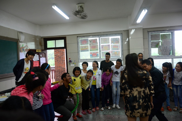 “Amazing Race”翻译成中文是“奇妙旅程”的意思。它和上次的“Global Village”(地球村)一样打破了传统的教室和班级的限制,以游园的形式来完成,是对课堂的彻底革命。把原来的13间教室缩减成5间,这5间教室就构成了本次奇妙旅程当中的5个驿站。每个驿站设一道“关卡”------须全班同学共同合作完成的游戏。这5个游戏分别是“逗笑主人”、“纸槽接龙滚乒乓球”、“手拉手过呼啦圈”、“手指相接传戒子”、“抗干扰数纸片”。
