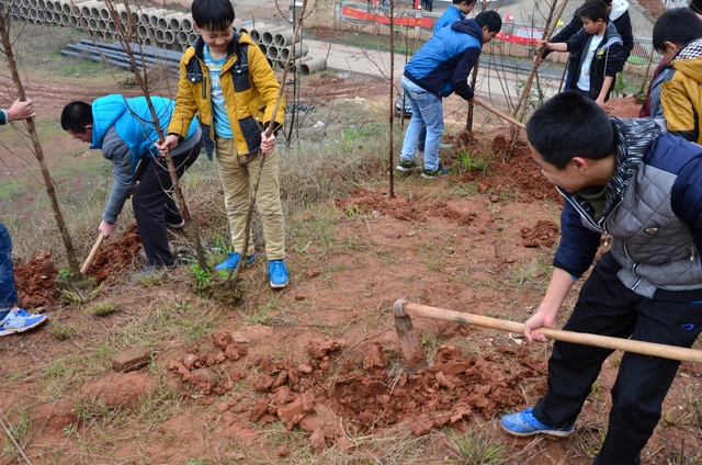 晚饭后六点钟左右,小学部五六年级的学生也不甘落后,在年级主任以及各班班主任的带领下纷纷捋起柚子,挥起锄头在小学部运动场周围植起树来。