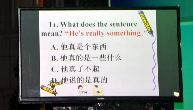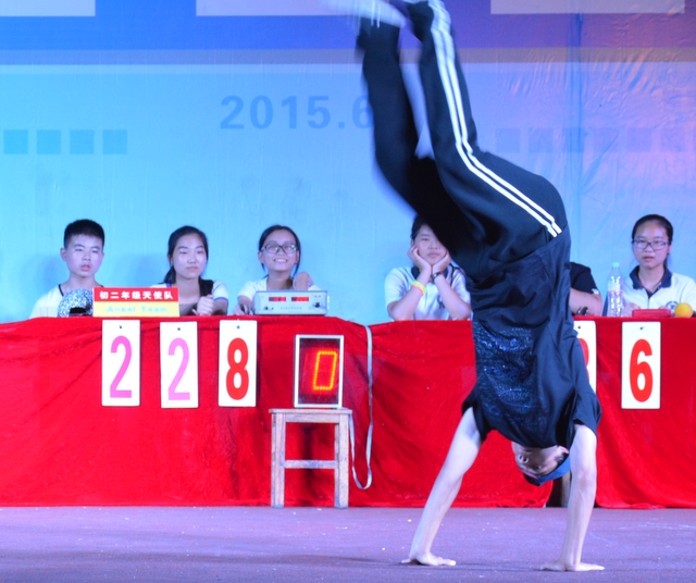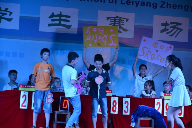 本次竞赛活动由六个板块构成即团体展示(Team Shou)、即兴讲故事(Making up Stories)、背诵(Reciting Competition)、风险题(Risky Questions)、模仿(Imitation Show)、才艺展示(Talent Show),并且分成三个部分,在部分与部分中间穿插了三个表演性的节目。整个活动流程有条不紊,秩序井然,其中“模仿(Imitation Show)”中惟妙惟肖的表演和“才艺展示(Talent Show)”中出其不意的出彩把整个活动推向了高潮。欢呼声,尖叫声,掌鸣声重重叠叠,裹着万般的柔情,从地上袅袅回旋上升,响彻了正源的夜空,因为精彩。