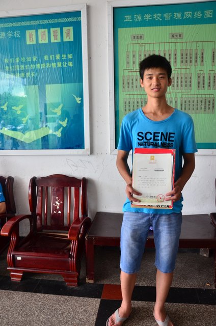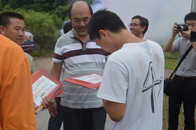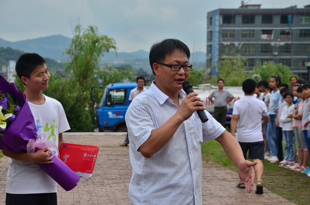 南操场正中间,欢迎的学生留出了一条“星光大道”,刚领了通知书的同学缓缓走了进来,又迎来媒体的新一轮长枪短炮,特别是谭智威同学,绝对是今日的明星!欢迎的学生中传来一阵阵整齐的声音:“谭智威,你最棒,你是我们的好榜样!”在学弟学妹们敬佩的目光中,谭智威、谢卓、刘雪琪等同学作了简短的发言。他们都认为是正源这一方风水宝地培养了他们,是正源的“2+4”使他们人生有了更高的平台。一向很能说的罗校长,可能太激动了,今日只讲了短短几句话:谭智威是个留守儿童,他四岁时,父母就去浙江打工了,今天这样热闹的日子也没有回来;我们正源五个考起清华北大的,有四个是留守儿童;考一个清华北大生可能是运气,但四年上了五个清华北大生就不是偶然的!