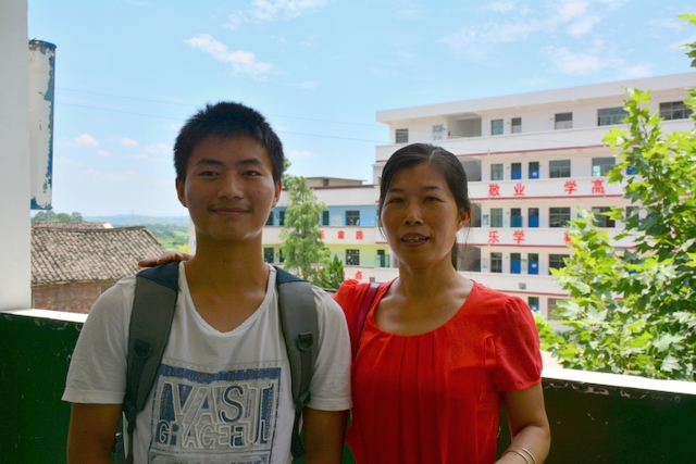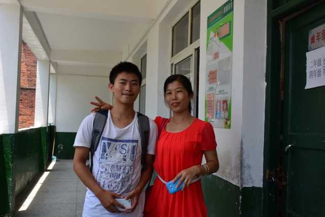 谭智威与数学老师谷永红在当年就学的教室前合影
