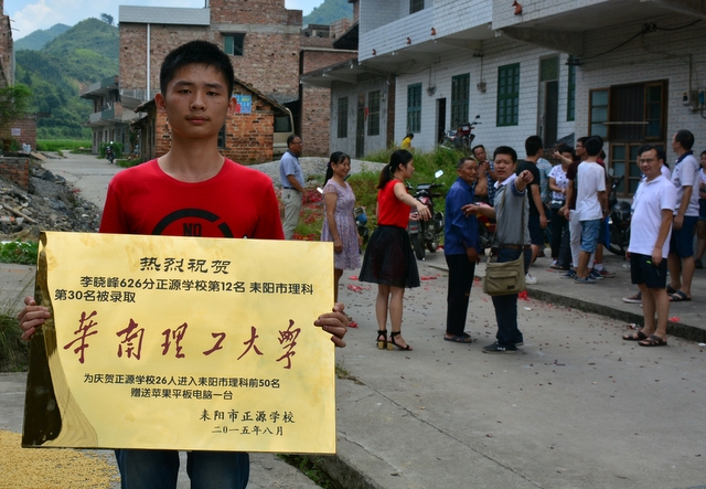 2015年8月22日,李晓峰的家乡——三都镇泰山背村三组喜气洋洋,亲朋好友云集一起庆祝李晓峰荣升大学。当日,罗校长应邀率领学校招生办主任李丰和李晓峰的高中班主任江宗斌老师以及初中部当年的班主任何礼建、科任老师刘湘华、俞务乃等前往李家。