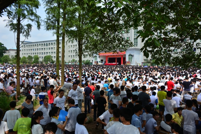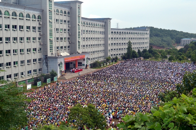 今天的广场,如同节日一般。教学楼大厅上方“热烈祝贺耒阳市理科状元谭智威同学被北京大学录取”的横幅特别耀眼,十盏大红灯笼鲜艳夺目。八点刚过,嘹亮的音乐声通过学校广播及时响起,各学部、各班级同学陆陆续续有序进入学校广场。