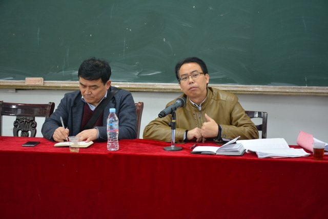 衡阳教科所工会主席陈寿林(右)在高三教师座谈会上